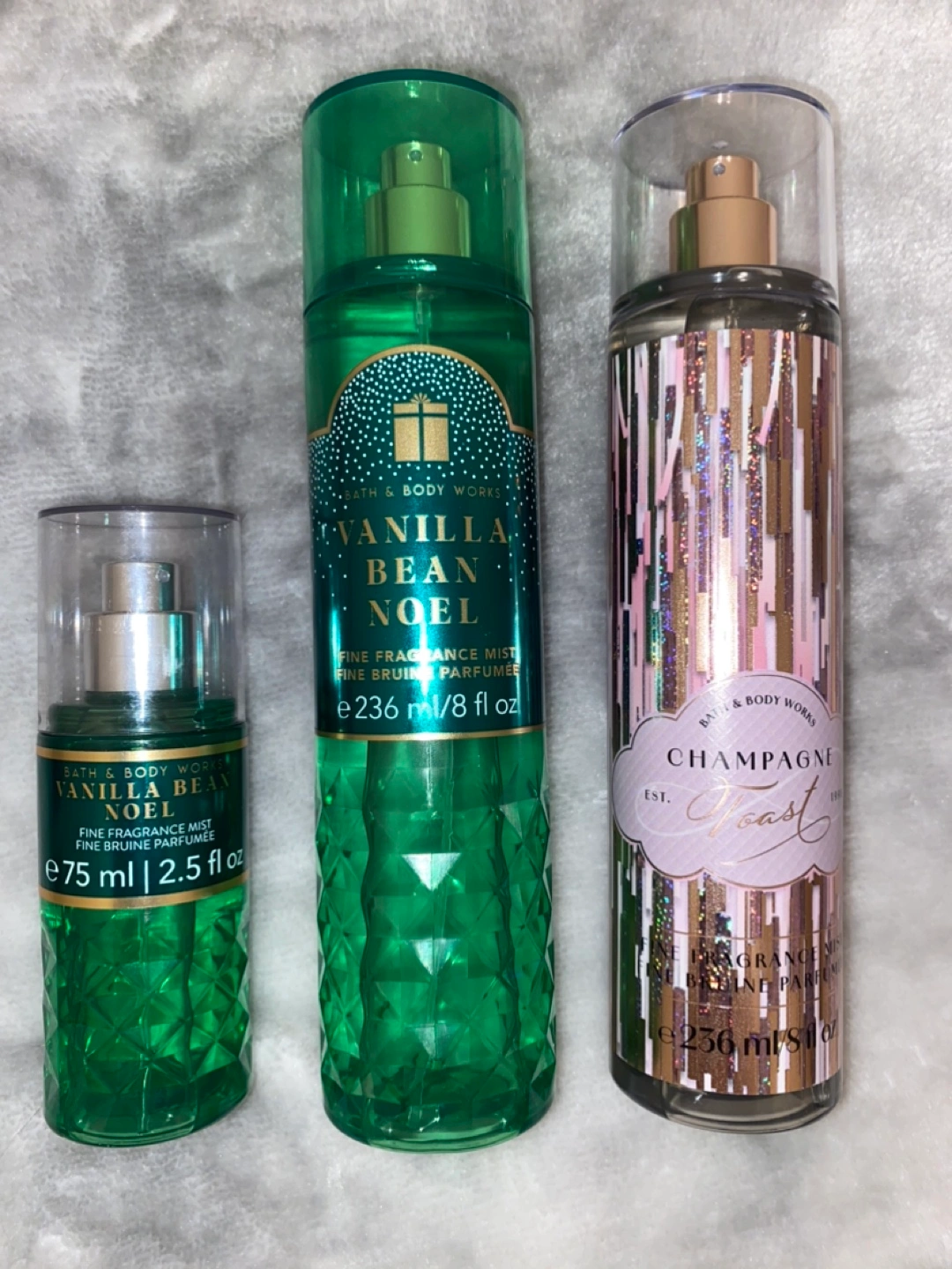 Bath & Body Works Vanilla Bean Noel and Champagne Toast Fragrance Mist. 3 bottles, 2 full size and 1 travel size. Sprayed a few times to test