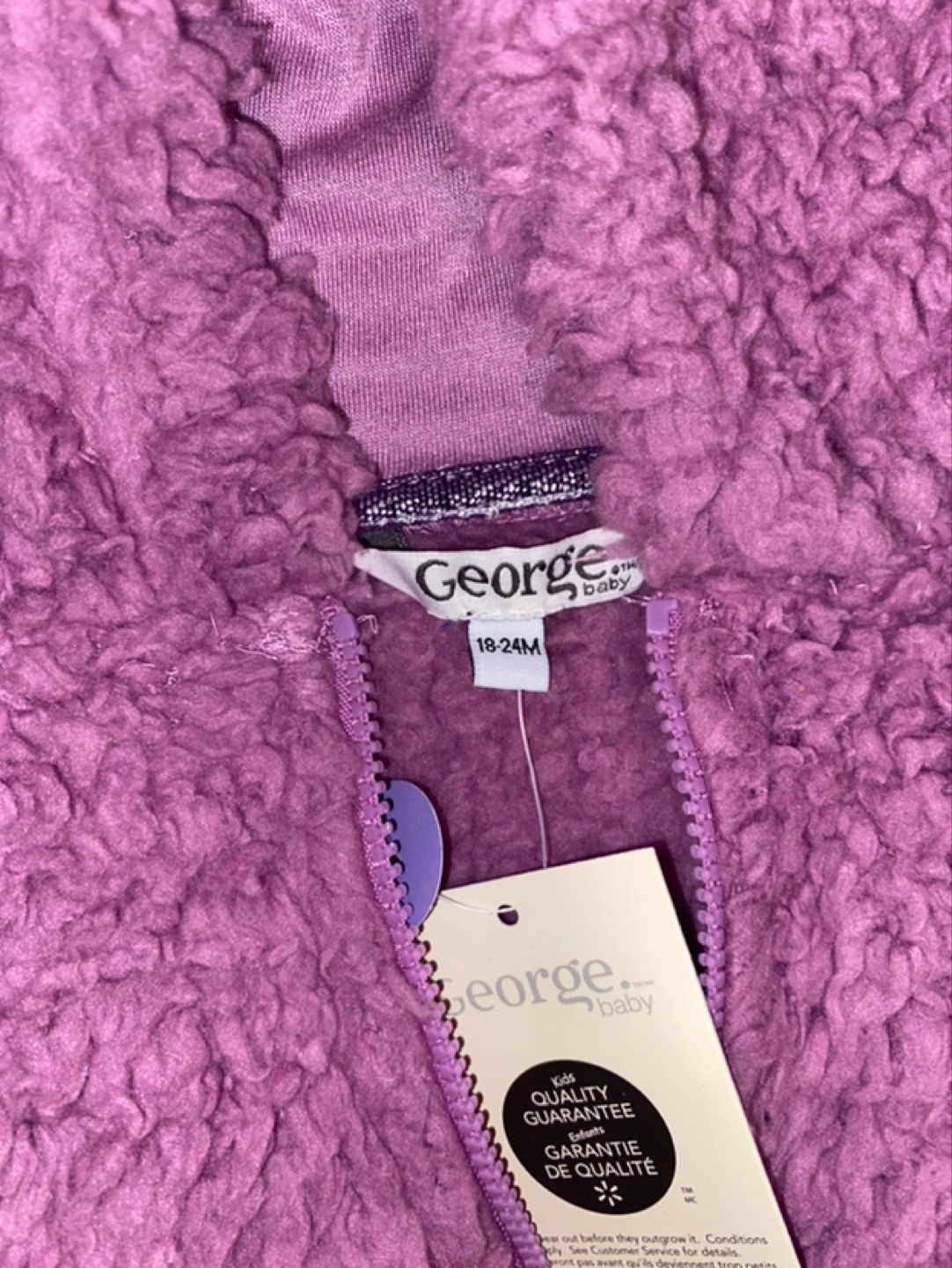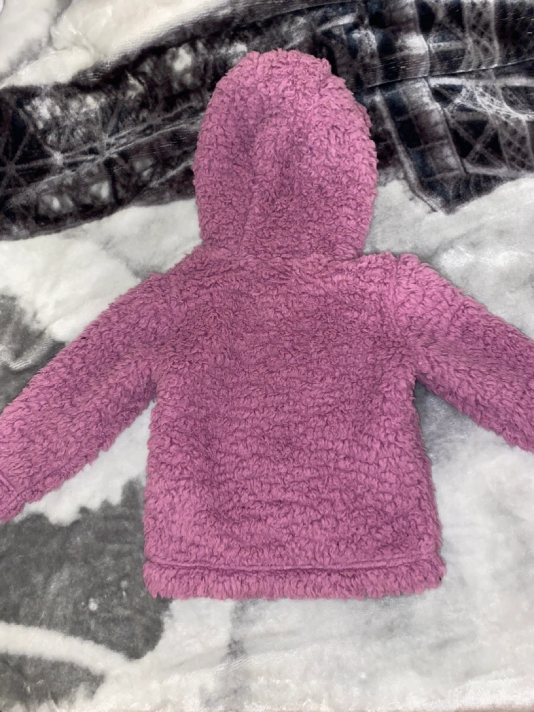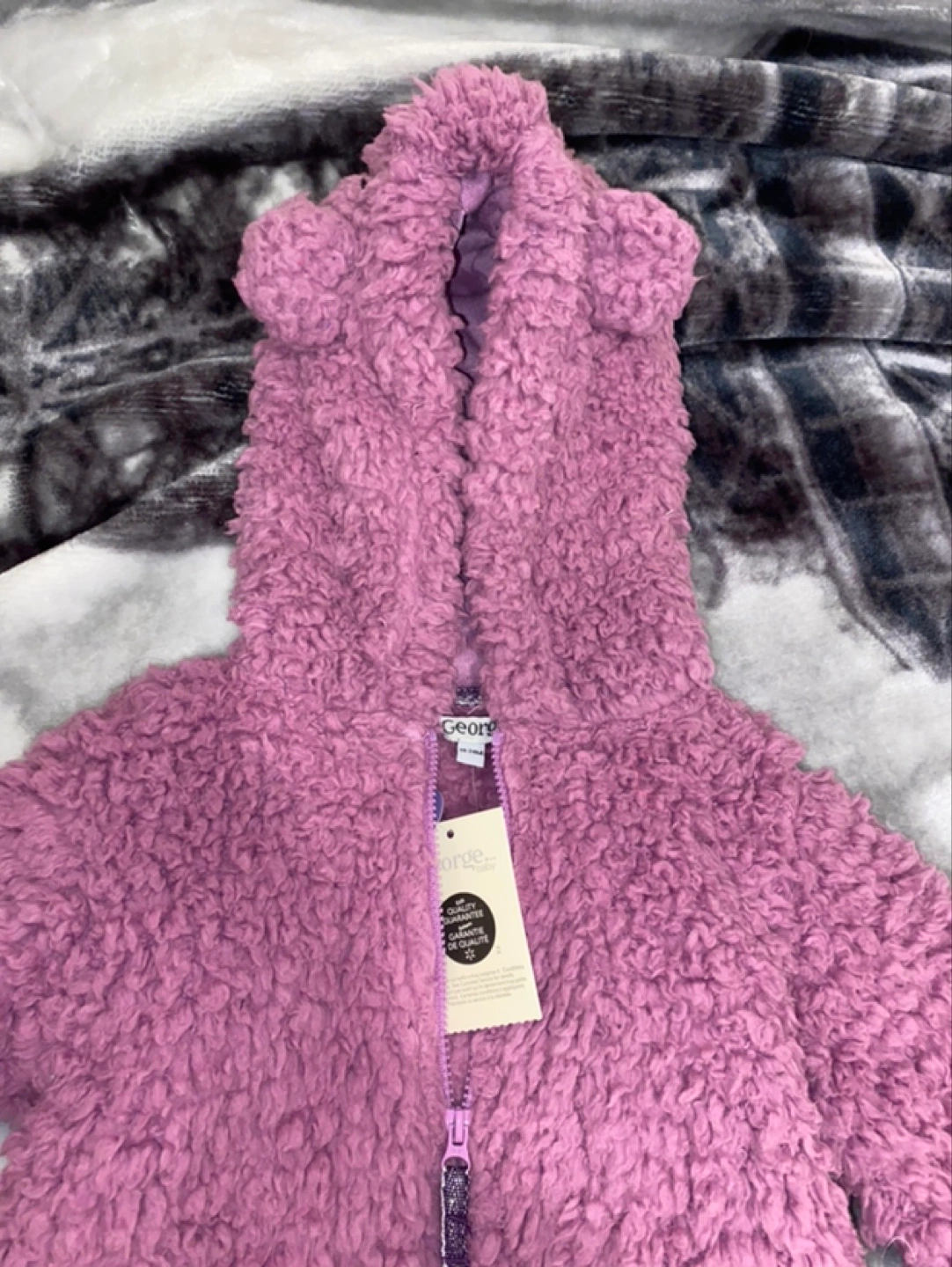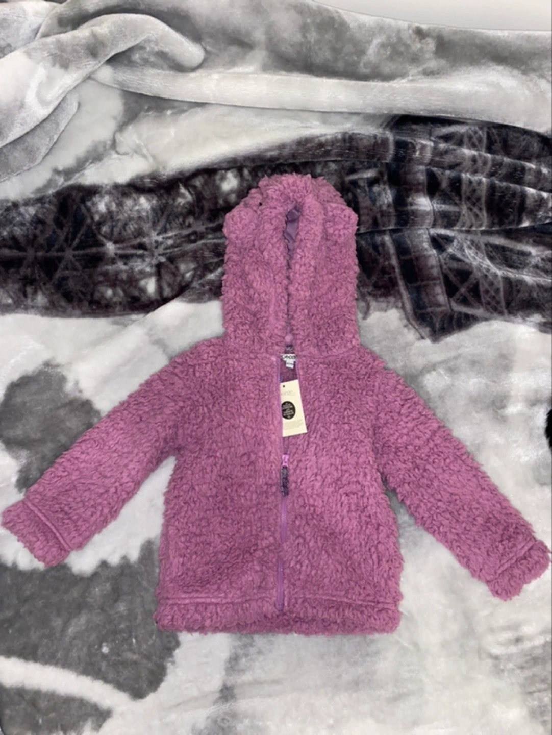 Purple fuzzy jacket with bear ears. Zip up closure.
