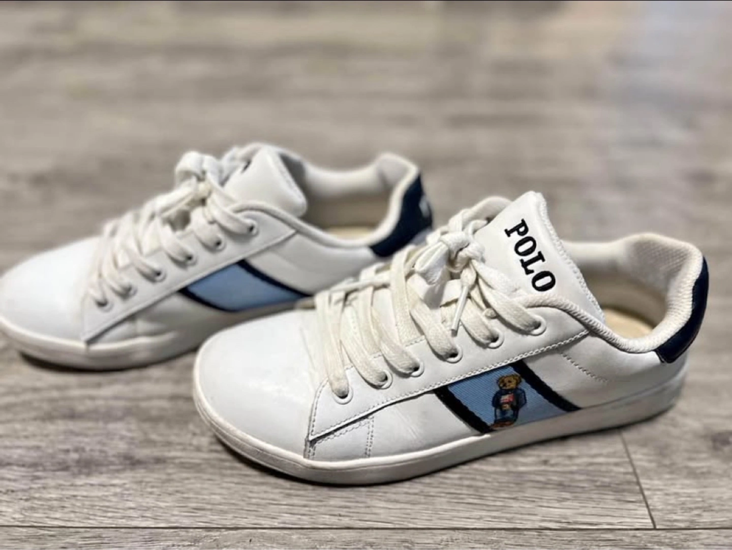 White leather sneakers with blue and navy accents. Features a small embroidered polo bear.