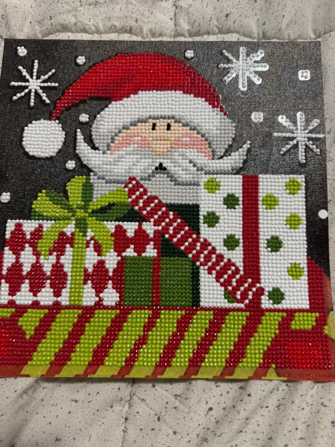 Diamond painting of Santa Claus holding presents with a black background and snowflakes. Completed painting.