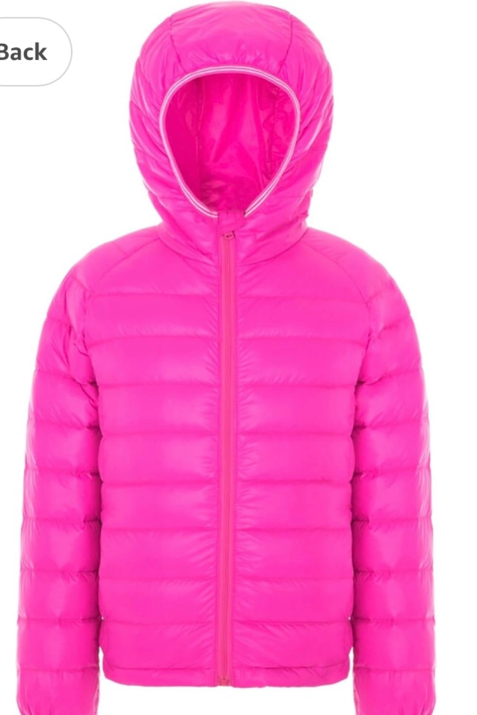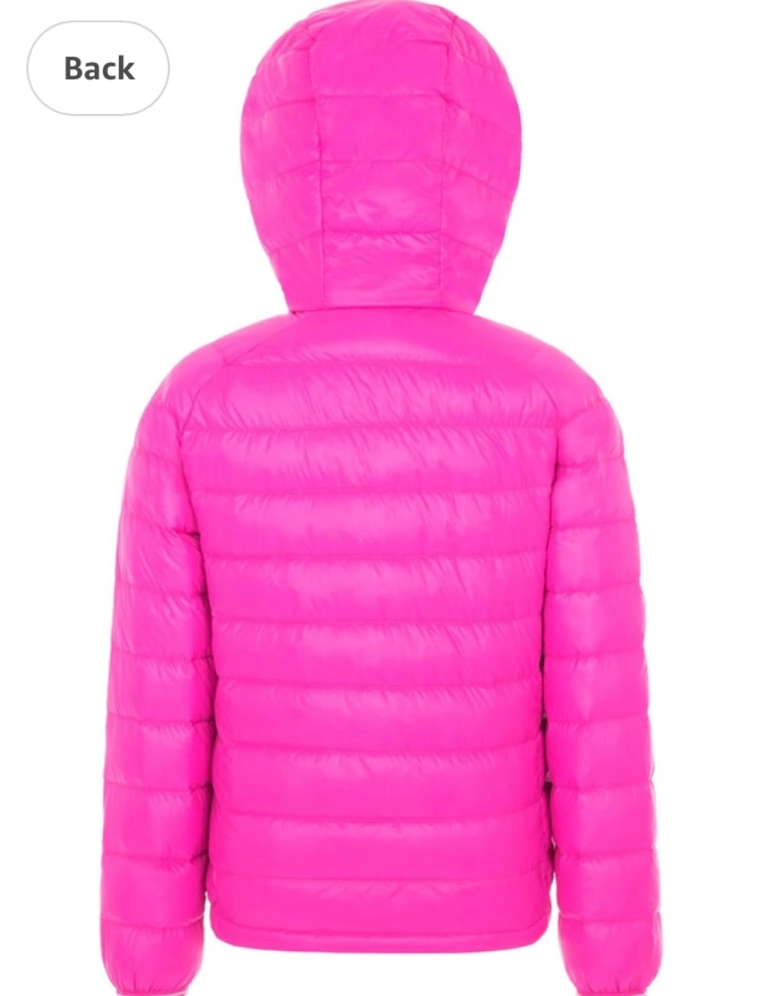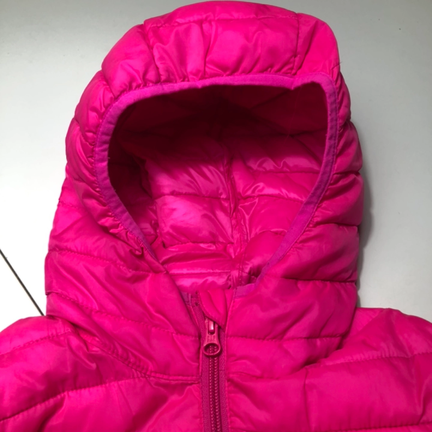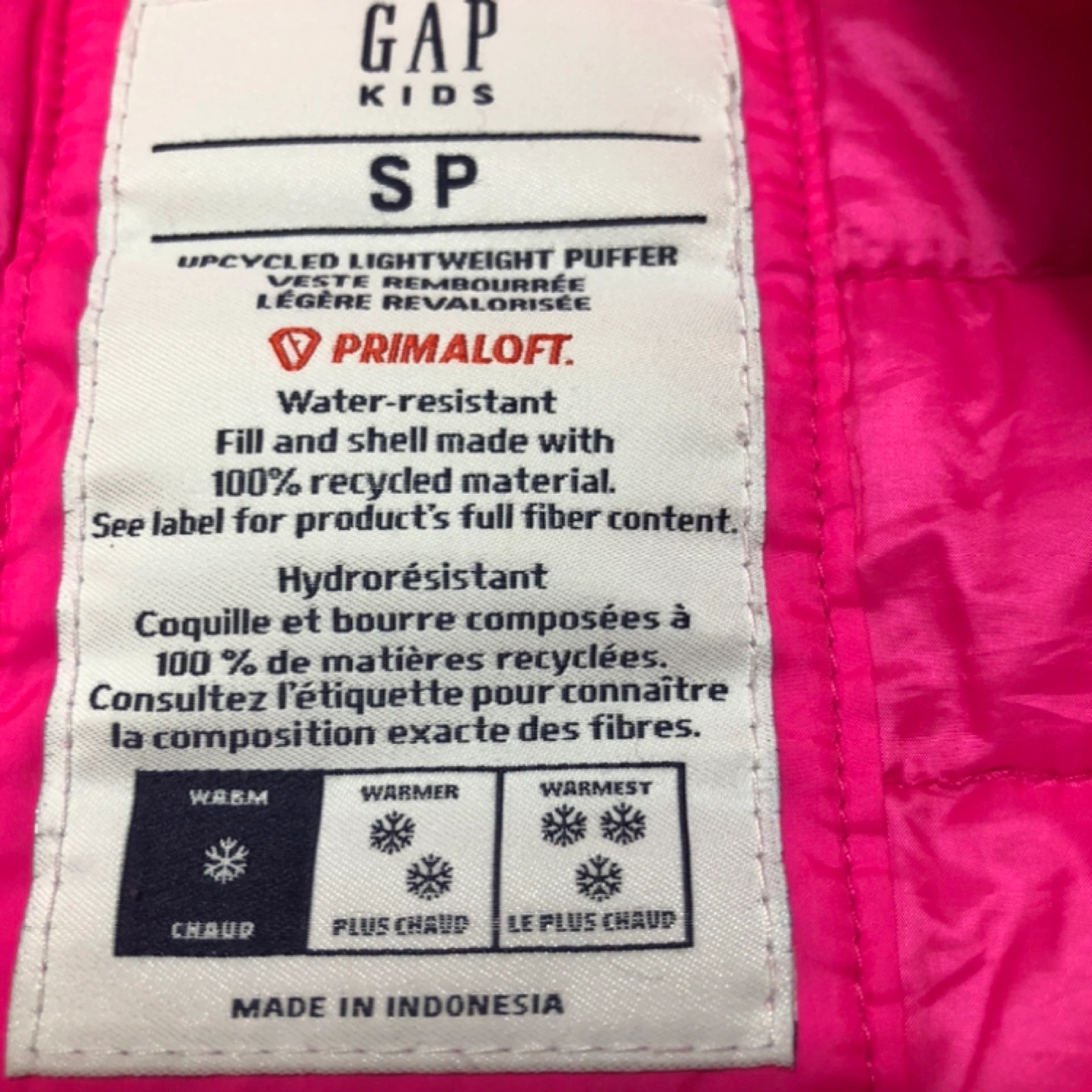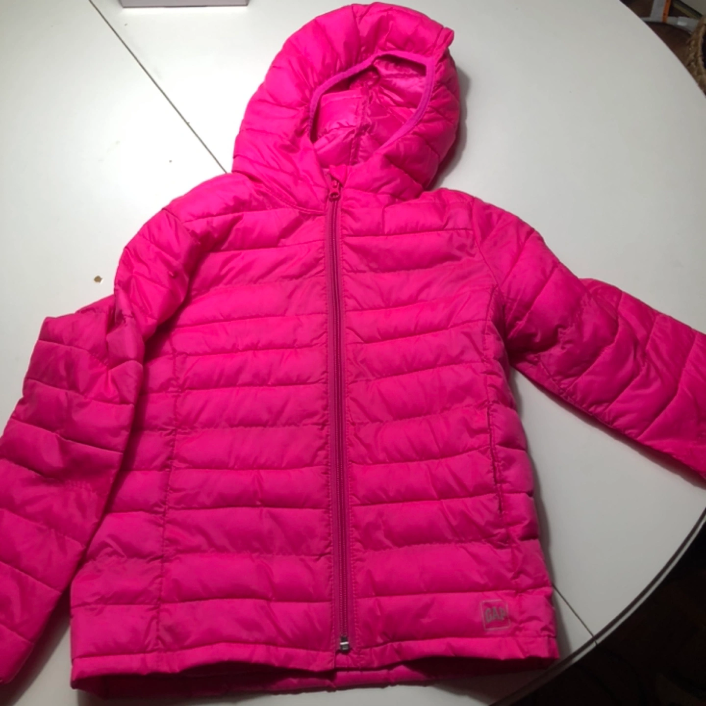 Pink primaloft puffer jacket with hood. Water-resistant; Gap size small would fit 6-8 year old. Warm and lightweight