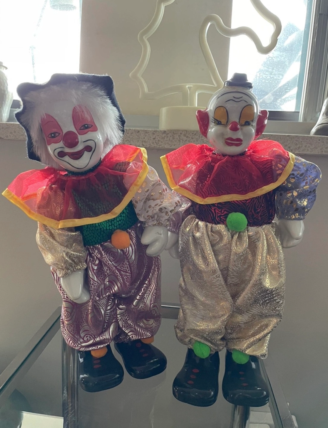 Set of two vintage porcelain clown dolls. Both dolls are wearing a red, yellow, and green costume. One doll has purple pants with a silver pattern, and the other has gold pants with a silver pattern. Both dolls have black shoes with red dots. You can wind them up from behind so they move their arms and play music. 10 inches tall You can pick up by Carlton and Jarvis area Serious enquiries only please. Too many people wasting my time and low balling and not following up.
