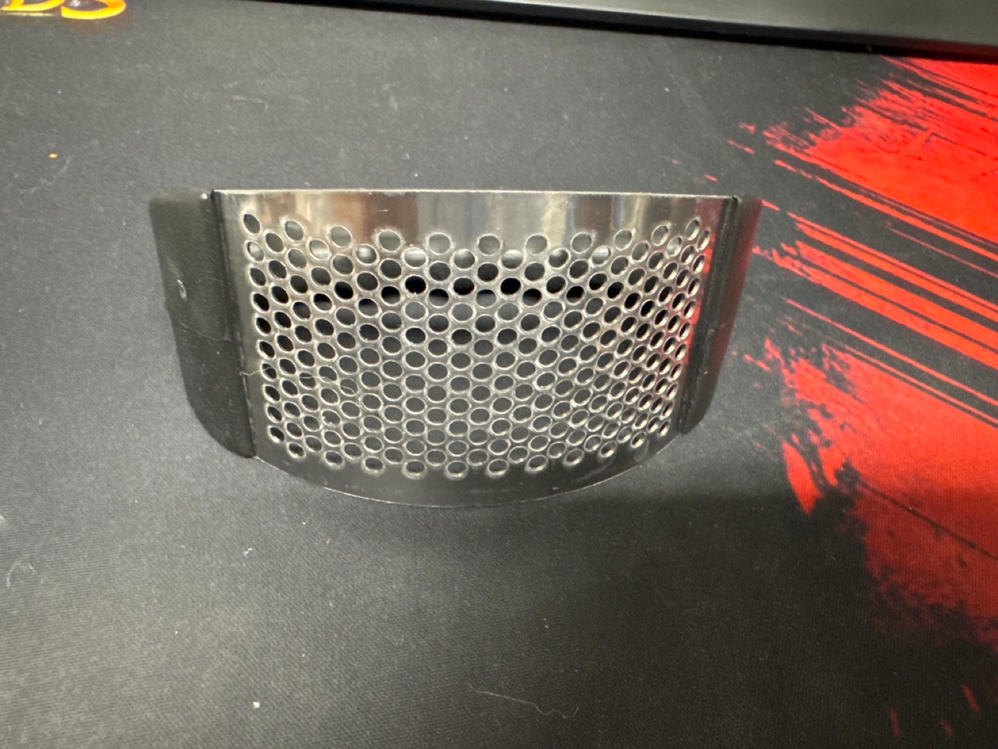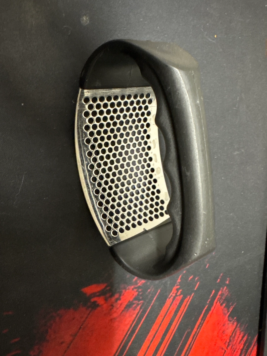 Stainless steel garlic press with a black plastic handle. Easy to use. New