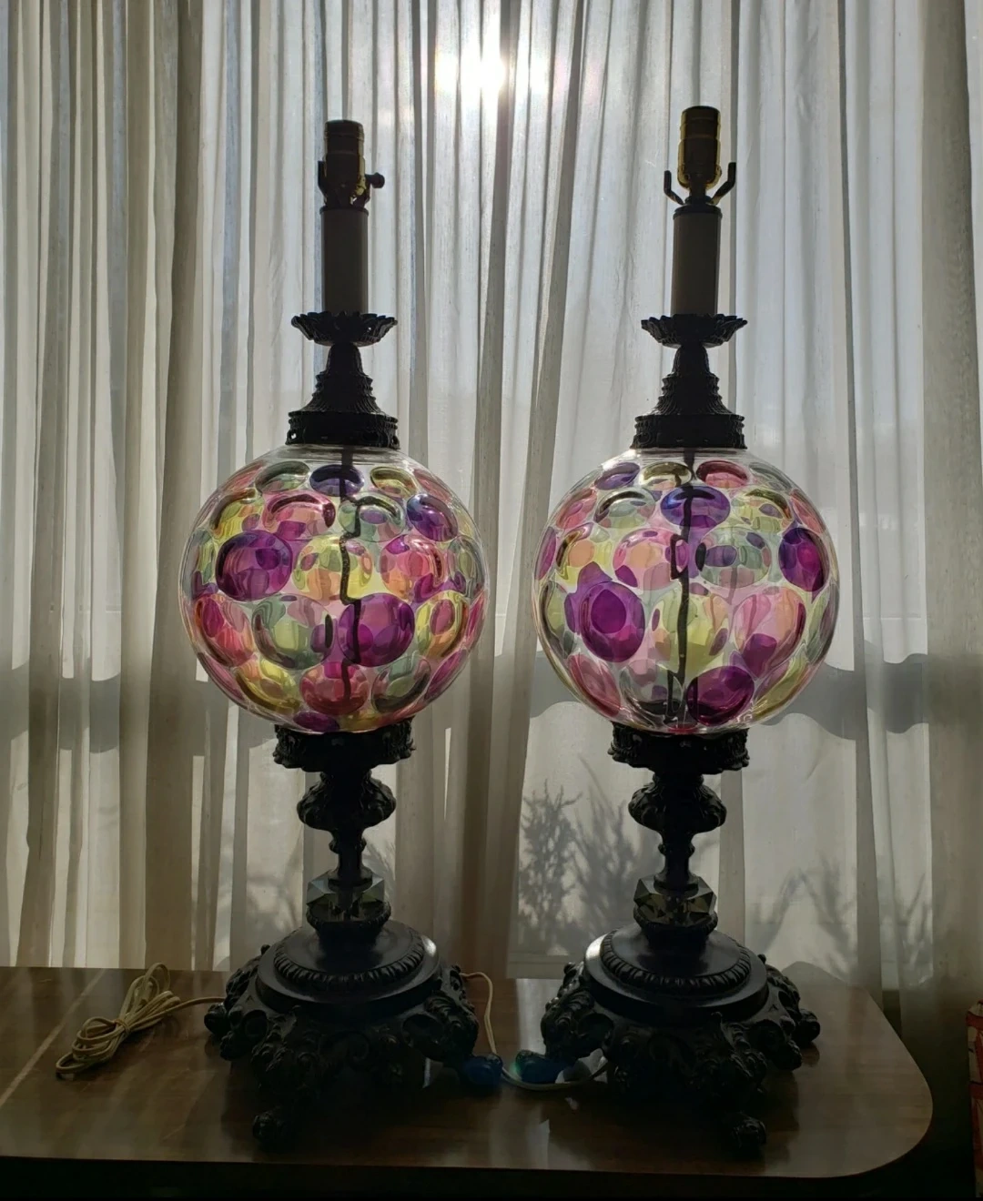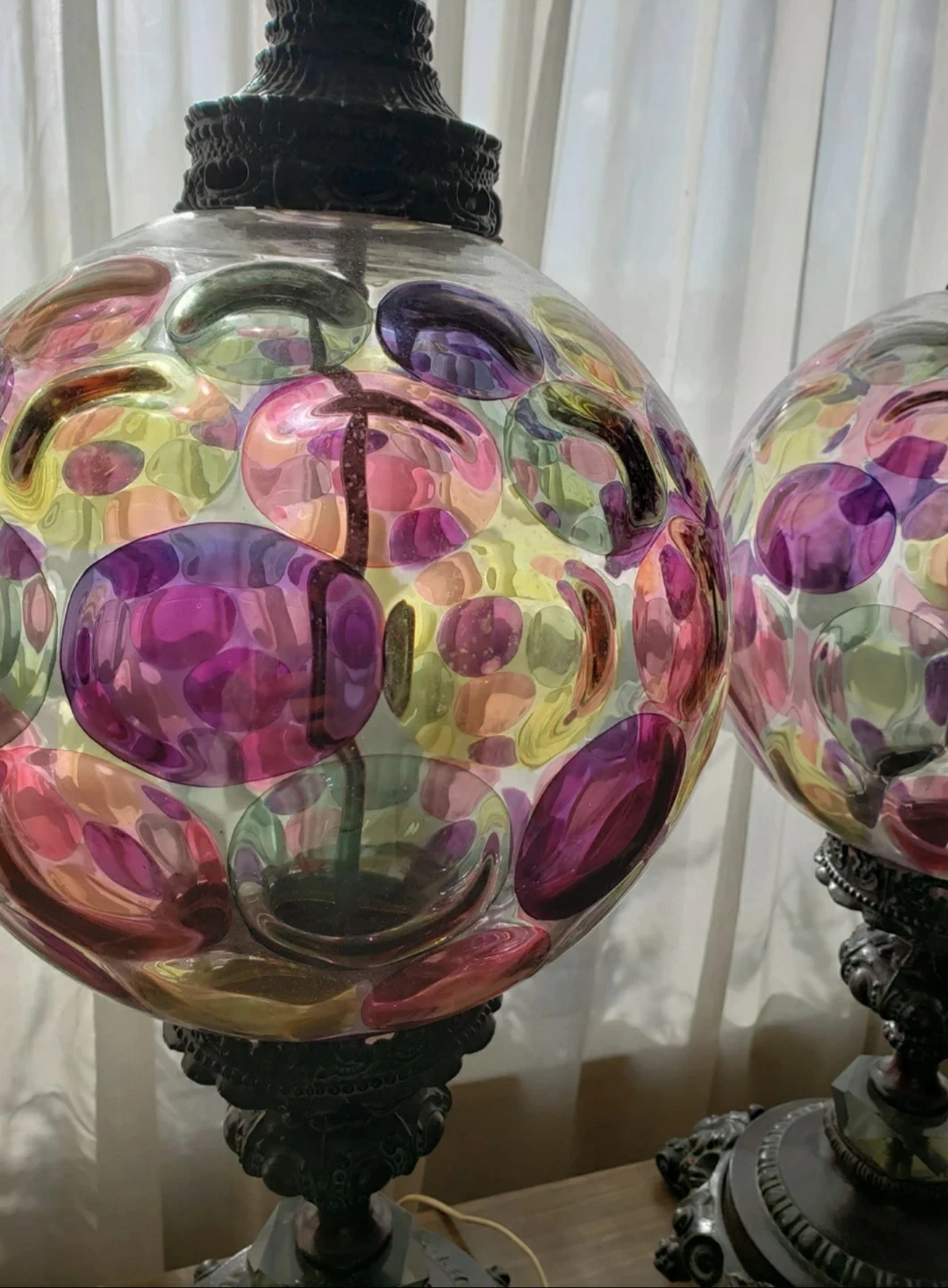 Pair of vintage table lamps with coloured glass globes. They are in good condition. Czech Optic from 70s