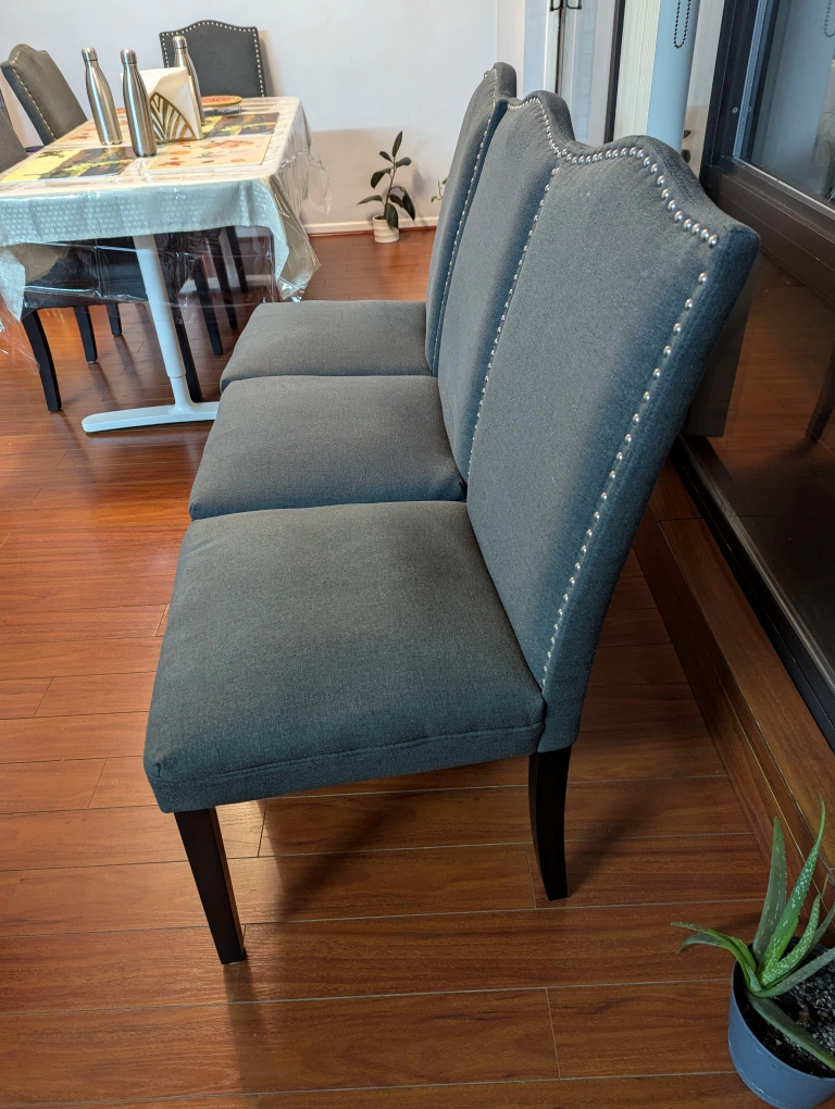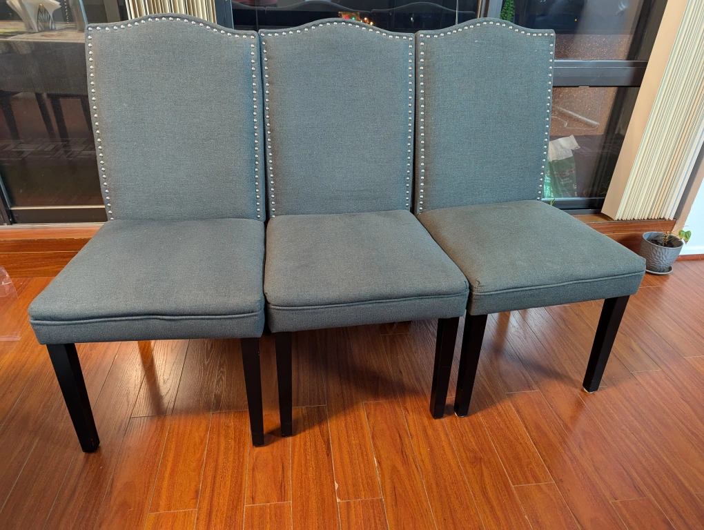 4 Grey fabric dinning chairs with black legs, nailhead trim in good condition are available for sale. I am selling as it doesn't go with my interior. No pets and No kids. Note: Table is not included