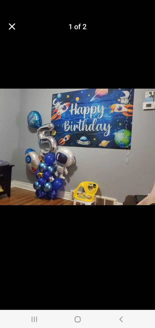 Space theme birthday decor. #5 included. Balloons not available. Include table cloth and back drop as well