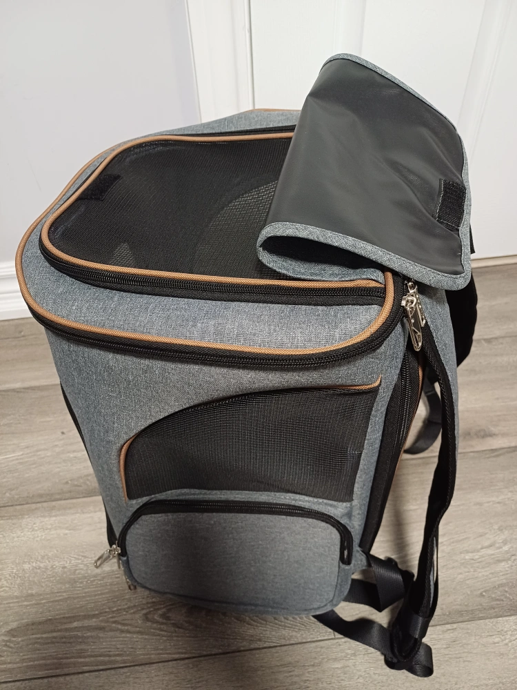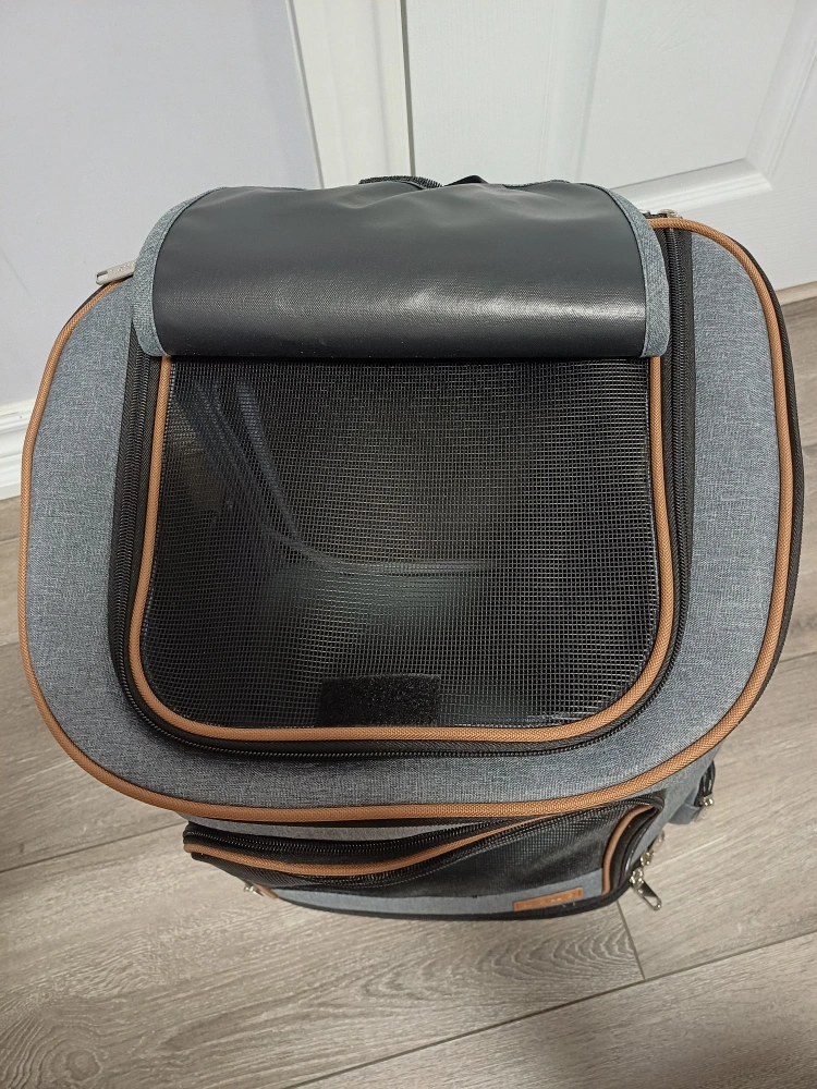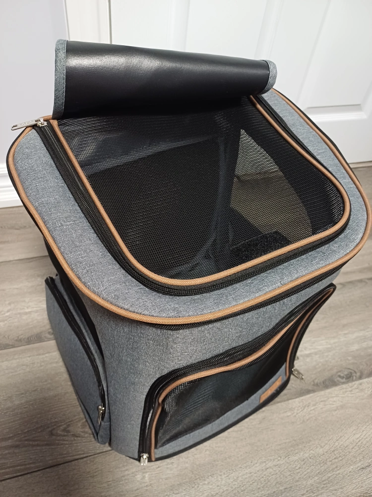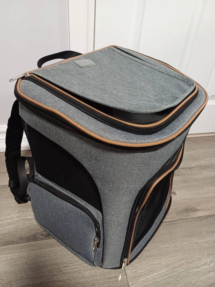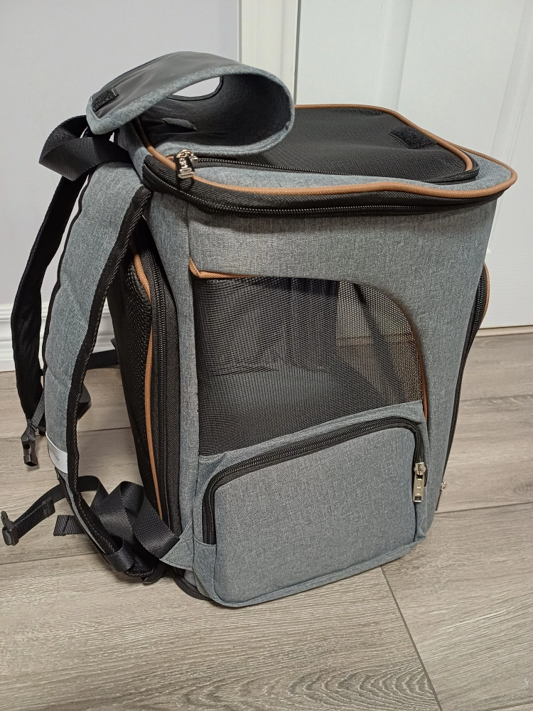 Brand new... LEKE grey pet carrier backpack. Airline approved pet backpack carrier for cats, small dogs, puppies under 13 lbs. Expandable carrier with three entrances and great ventilation. Has side pockets too.
