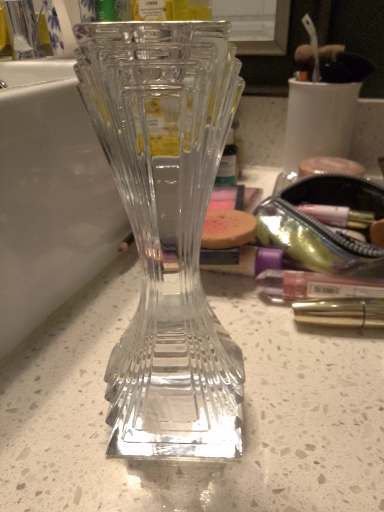 Crystal candle holder, tall and elegant, great for a special occasion. Clear glass. About 7.5 inches in height.