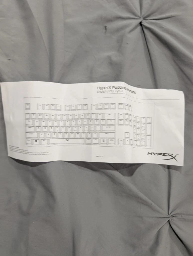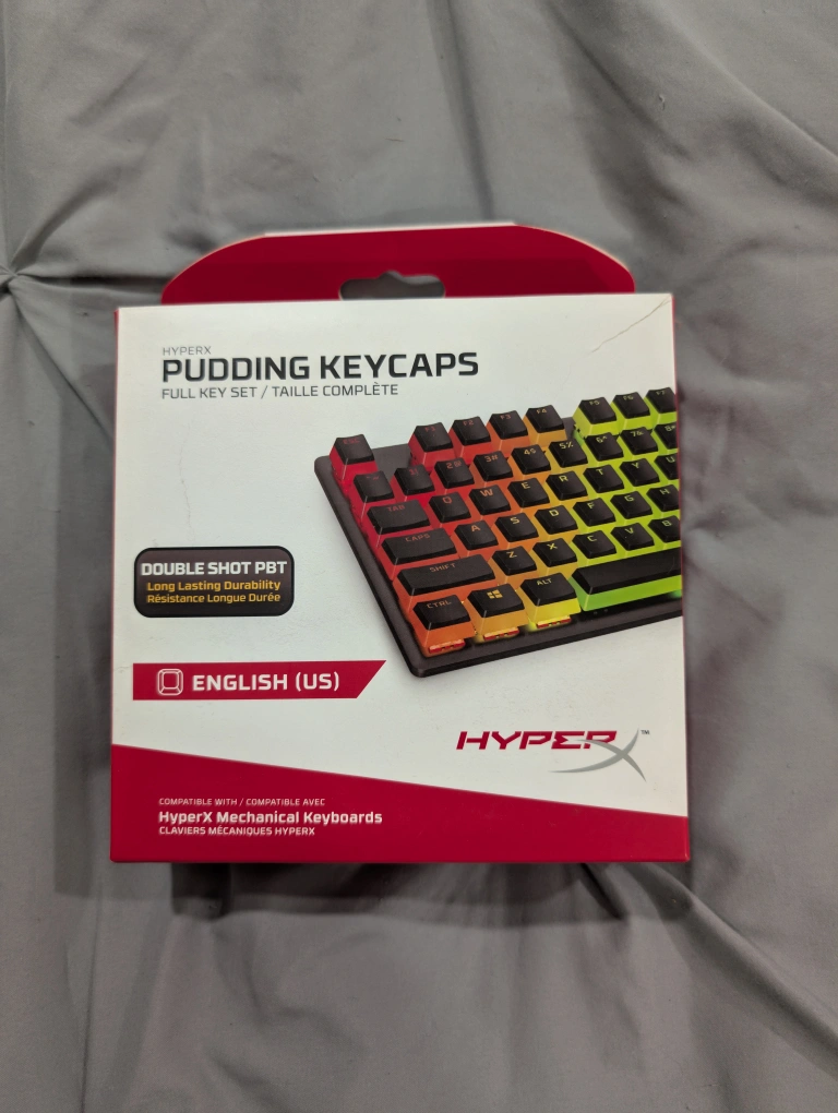 Double shot PBT keycaps with a pudding design, compatible with HyperX mechanical keyboards. Includes a keycap puller. English (US) layout.