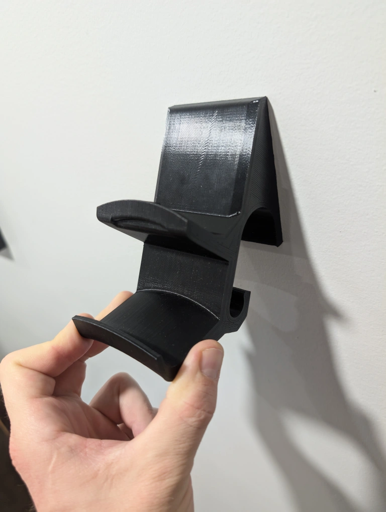 3D printed wall mount for PS5 accessories. Mounts to the wall with mounting tape. Can hold a headset and controller.