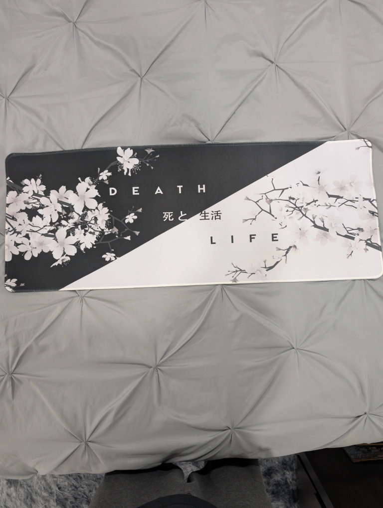 Black and white mousepad with cherry blossom pattern and text, 'Death and Life'.