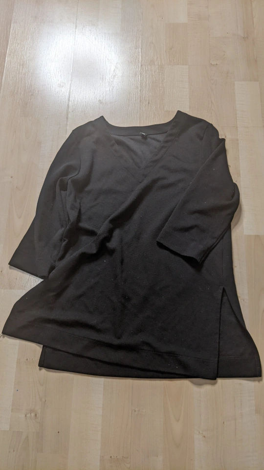 Black 3/4 sleeve v-neck top with side slits. Long tunic style.