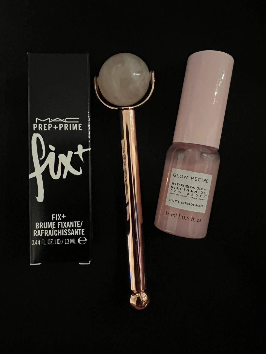 Glow Recipe Watermelon Glow Niacinamide Dew Drops (full size), MAC Prep+Prime Fix+ Setting Spray (travel size), and rose quartz Sephora face roller. All items are brand new, unopened, and in their original packaging.