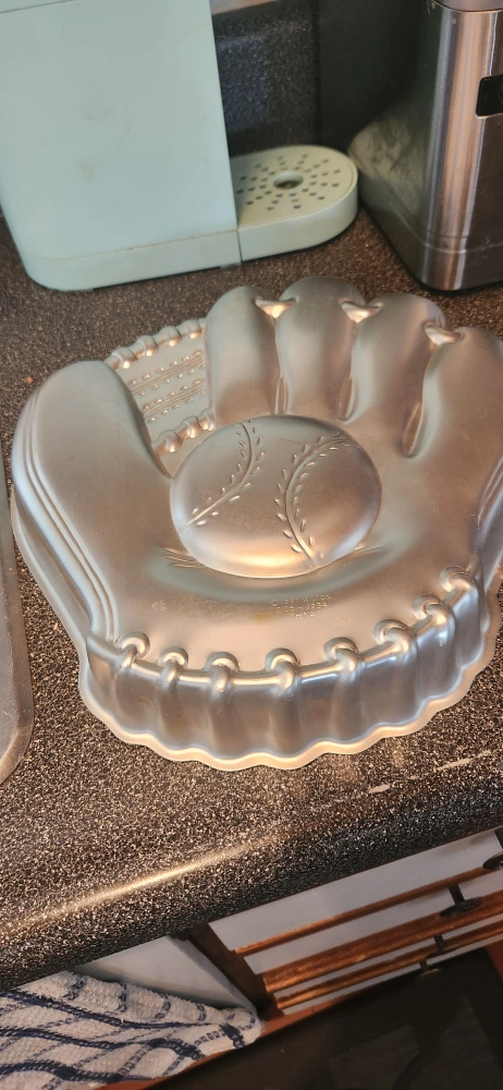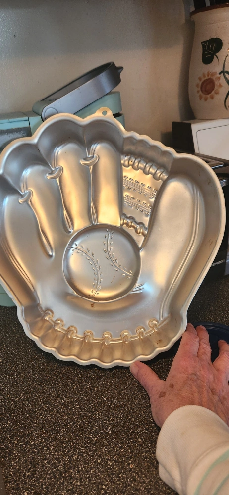Aluminum cake pan shaped like a baseball glove. Great for a baseball-themed party.