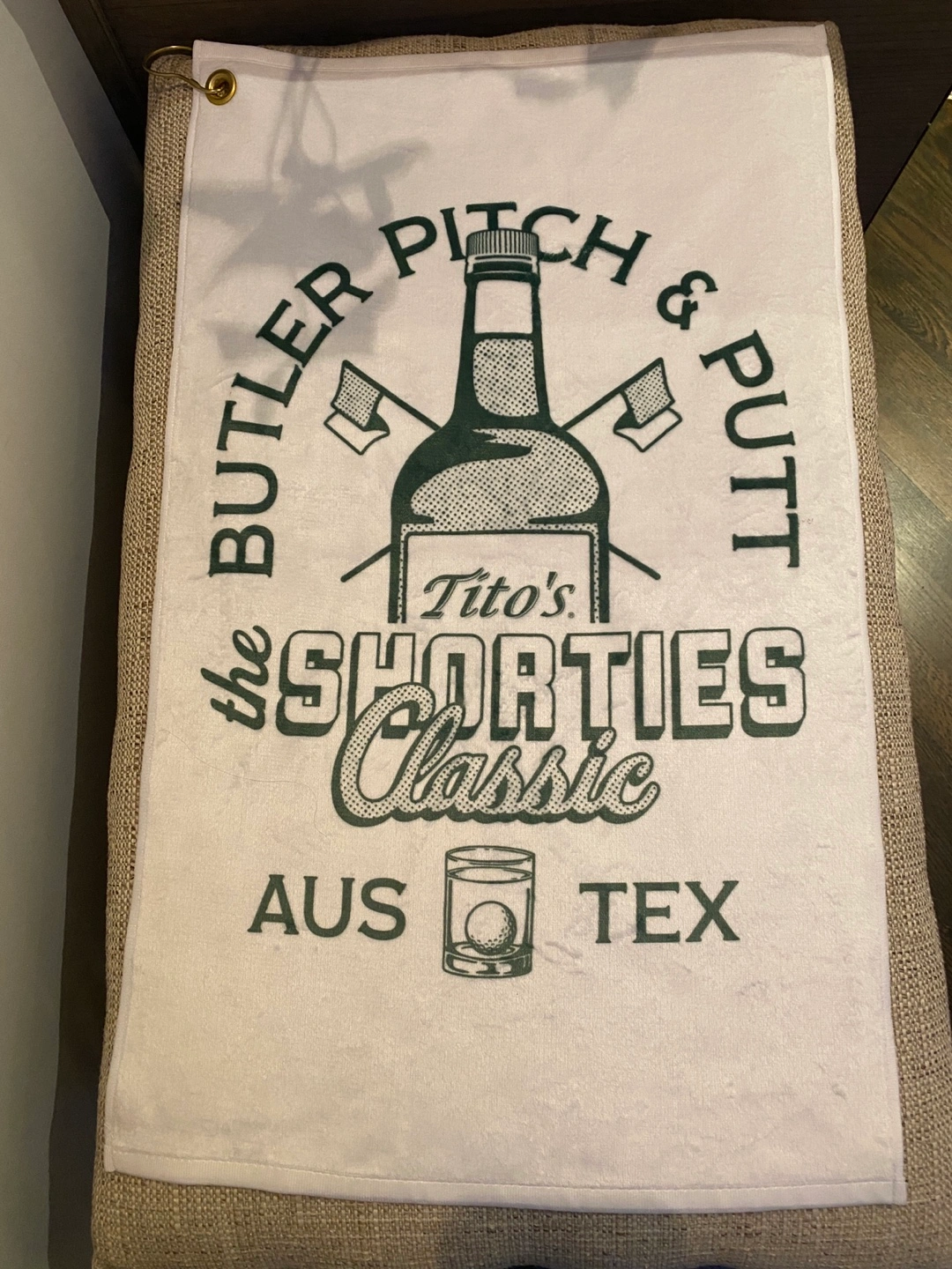 White golf towel with a design featuring a bottle of Tito's Vodka, crossed golf clubs, and the words 'Butler Pitch & Putt' and 'The Shorties Classic'. Am gifting on a first come basis (within 24 hrs), if picking up later, please reach out, if still available, when ready to pick up same or next day. Pick up near Bayview and Eglinton, address shared once mutual date/time for pick-up confirmed.
