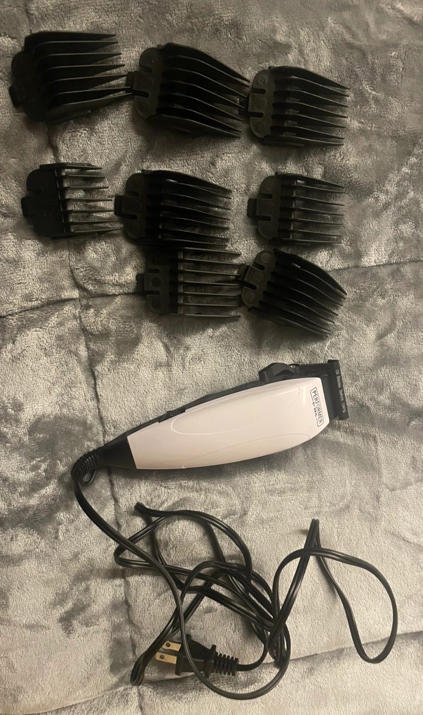 Corded hair clipper with multiple attachments. Includes cord and various comb attachments.
