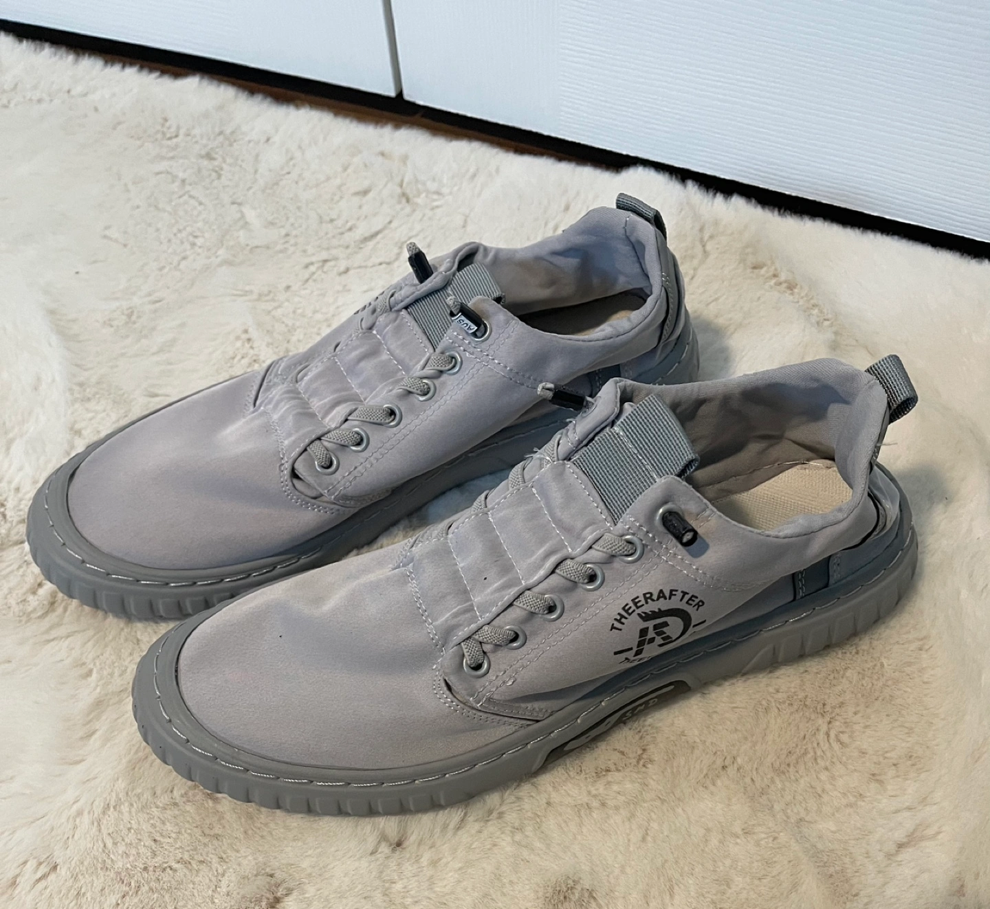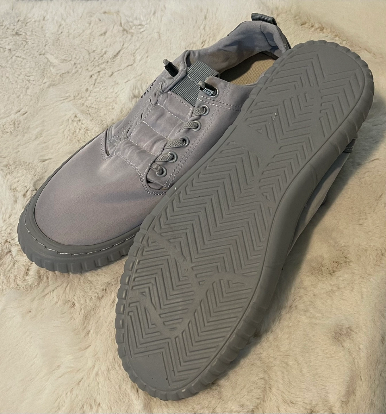 Grey sneakers with laces. Features a strap on the back of the shoe and a rubber sole.