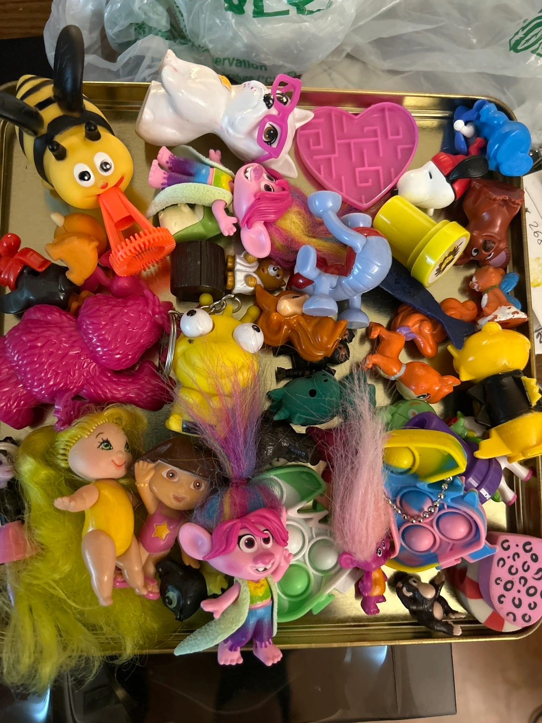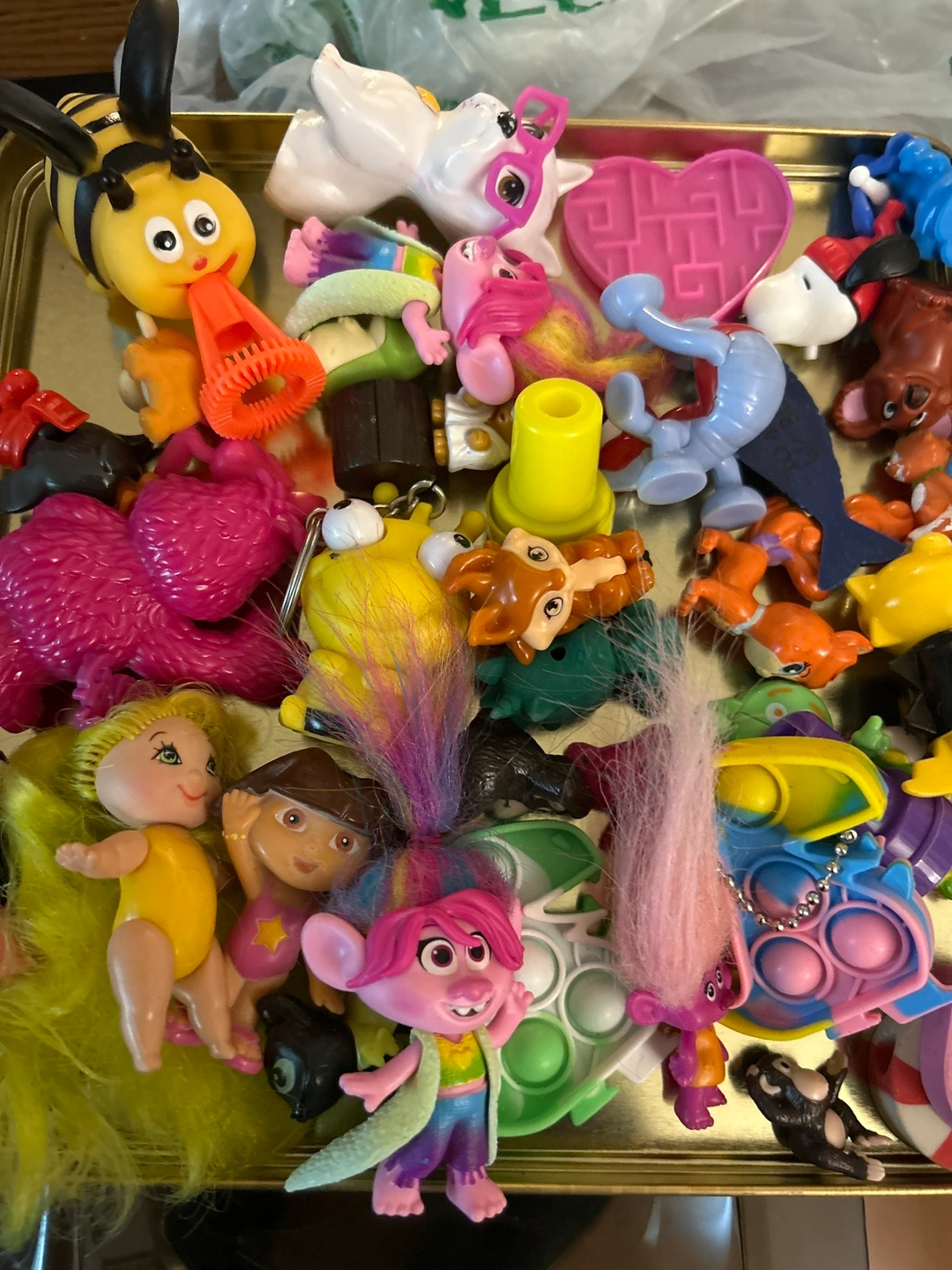 A large lot of small toys including figures, keychain toys, and a pop-it. Some of the toys are from popular kids' shows. The lot is in used condition, but still in good shape.