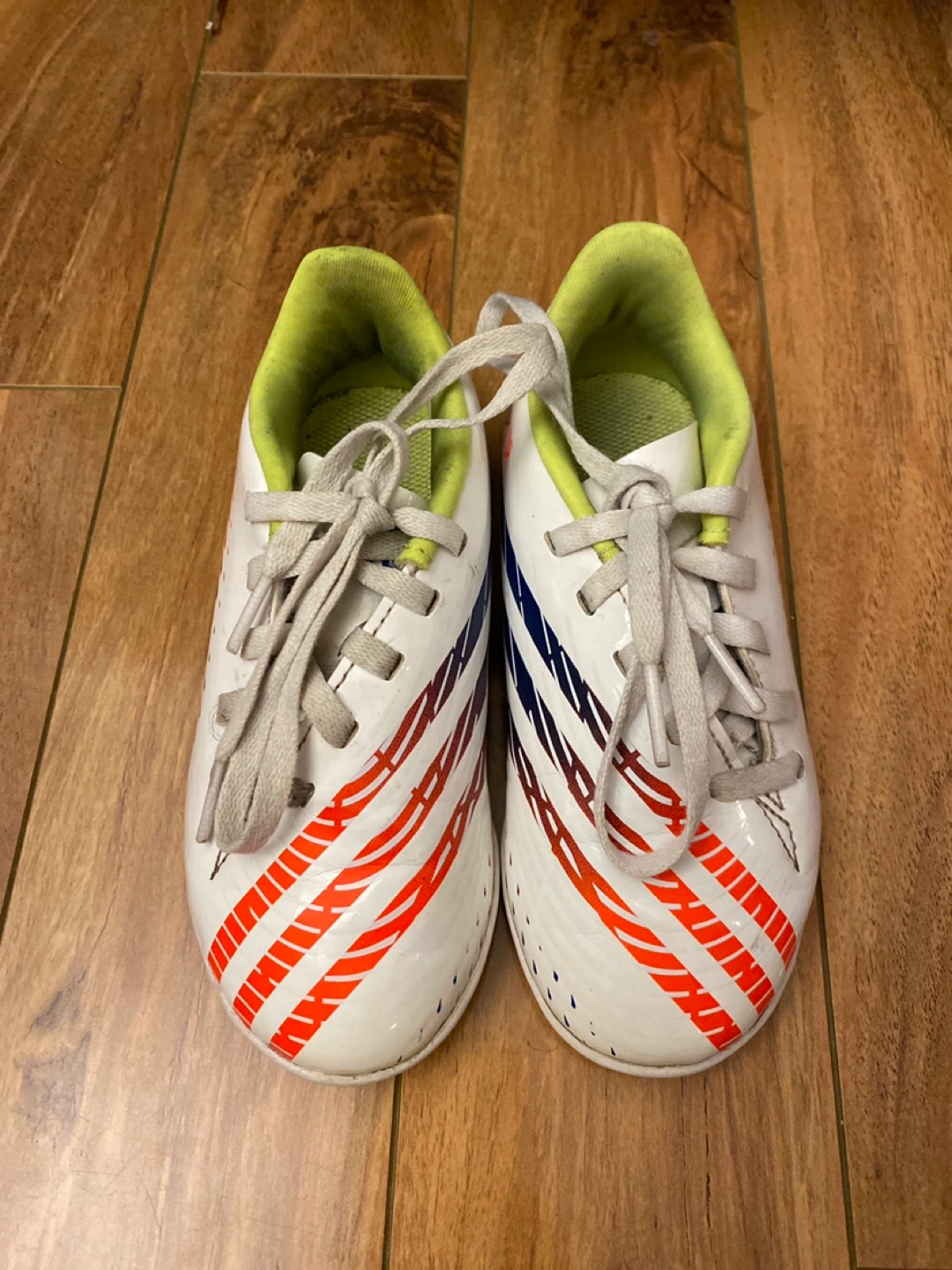 White soccer cleats with orange, blue, and purple accents. Size 10.5 (US)