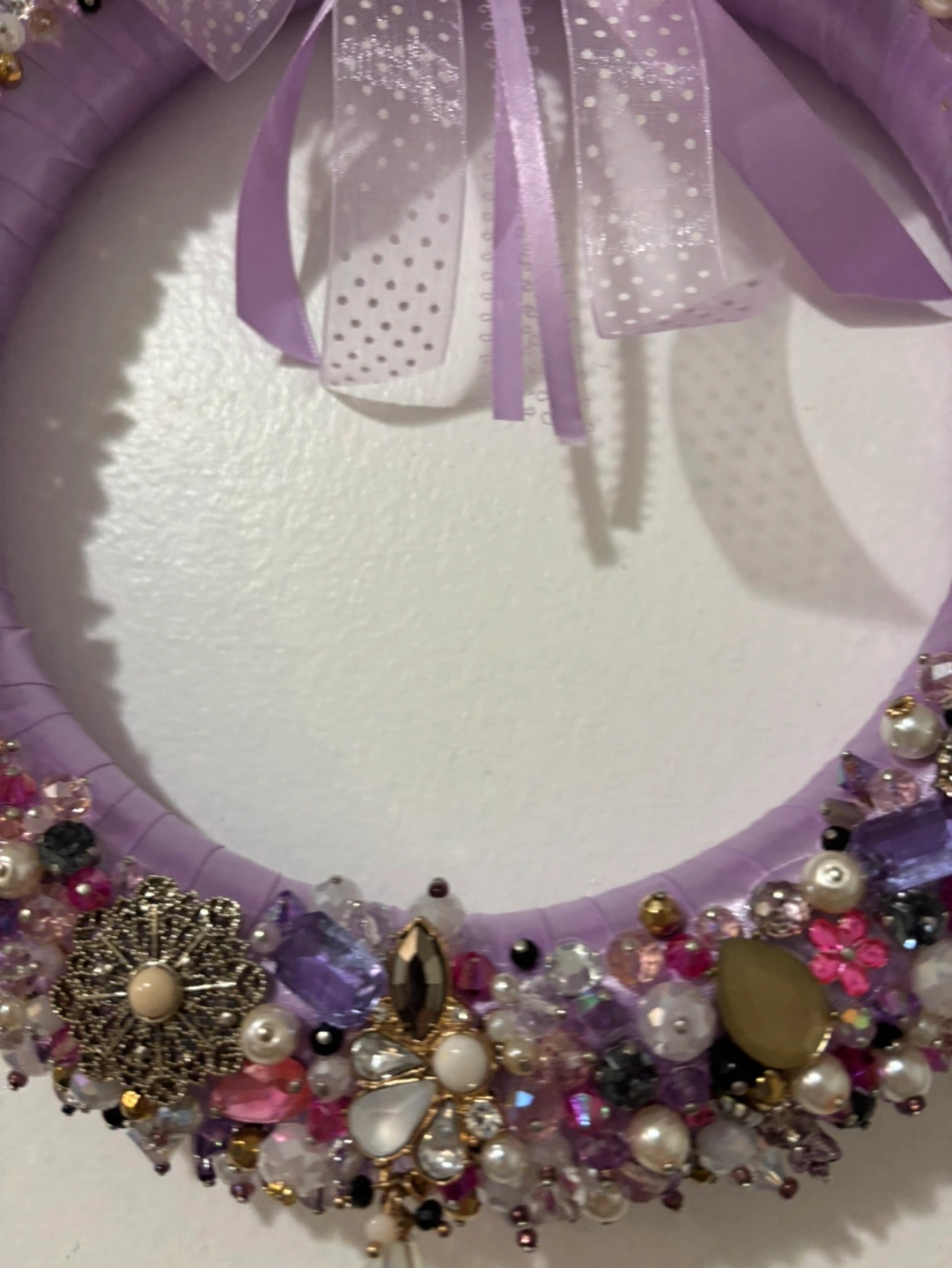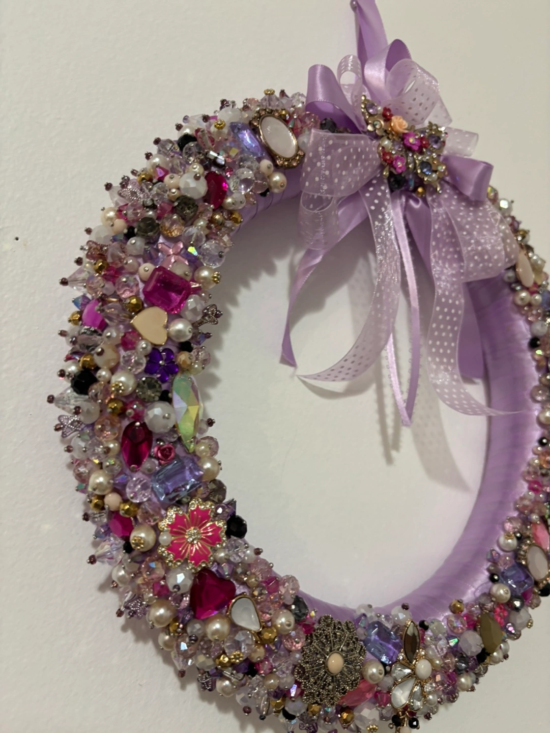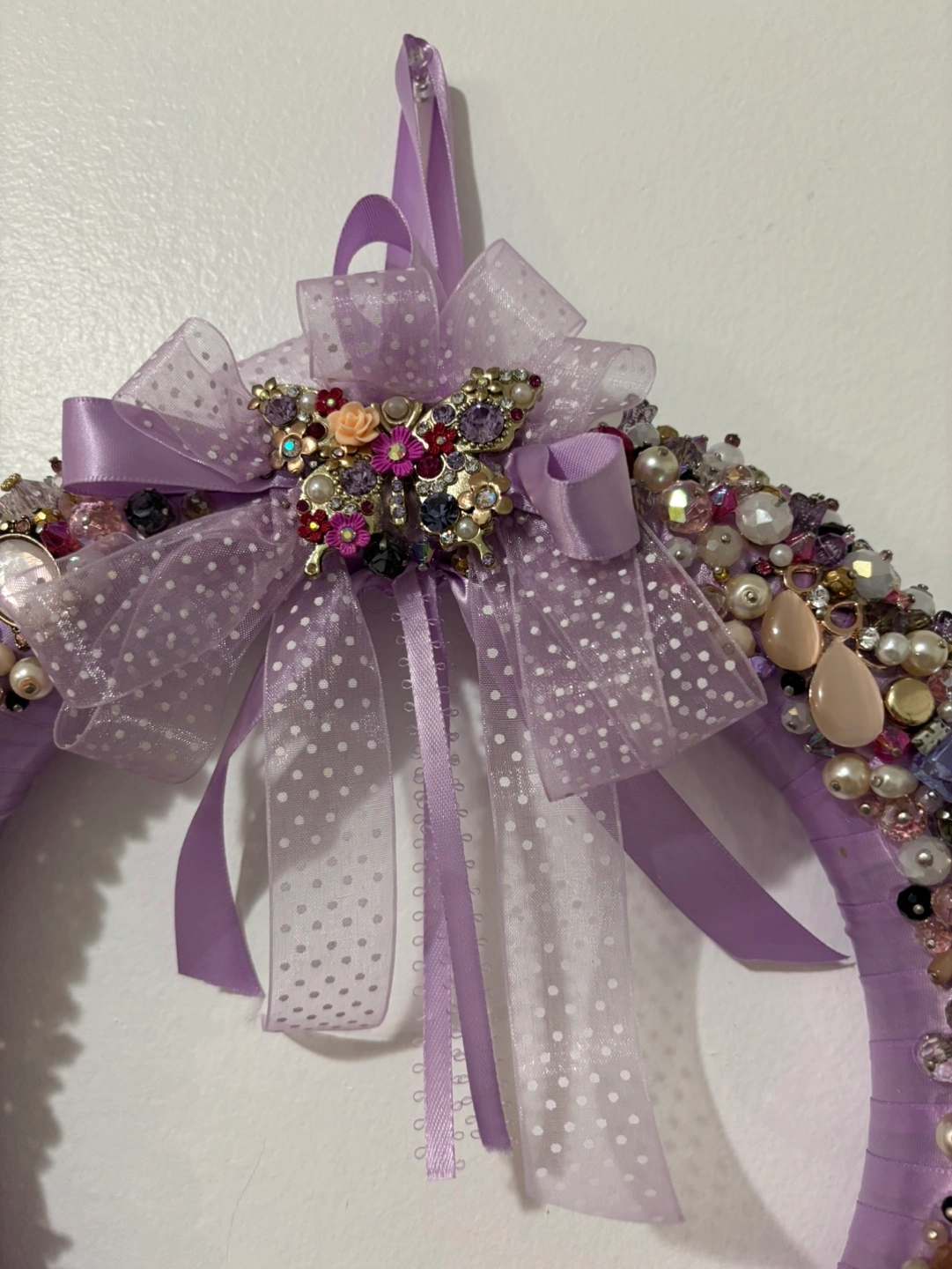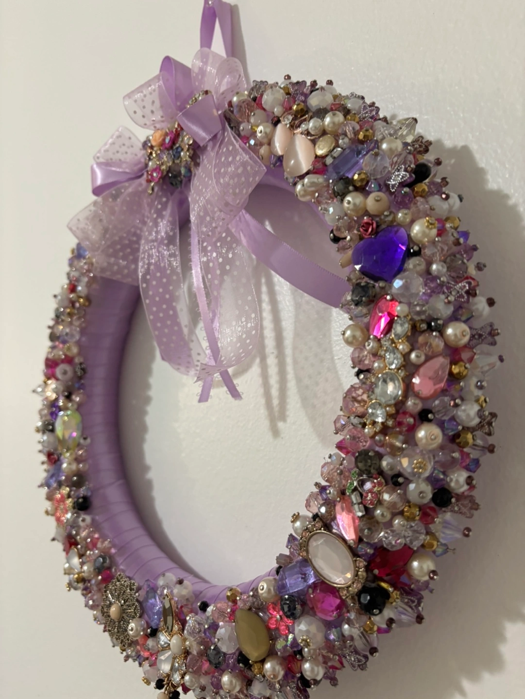 Purple wreath decorated with assorted beads and jewels. Features a bow with a butterfly brooch. Beautiful for home decor or Christmas decor or gift. Colours: purple, pink, pearl white, gold and black Price firm, cash only, payment at the time of pickup in Mississauga
