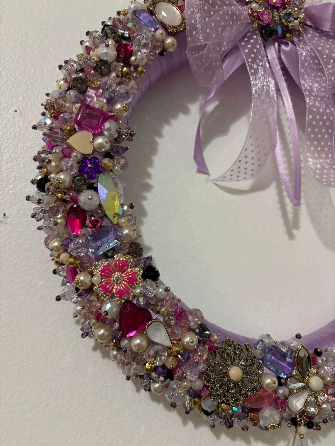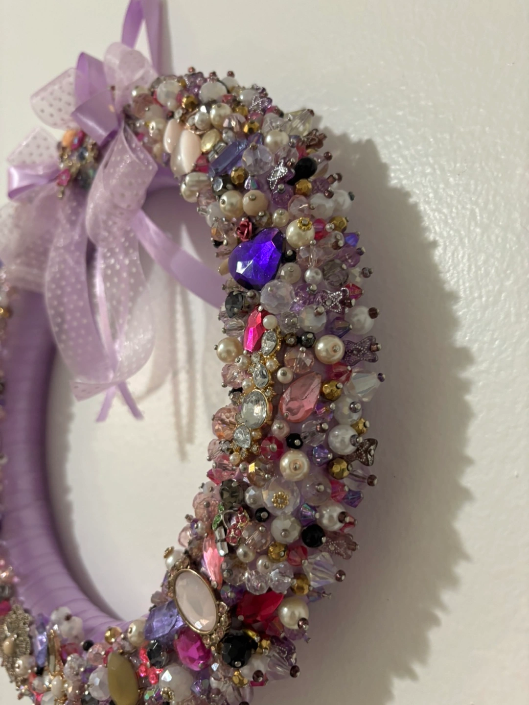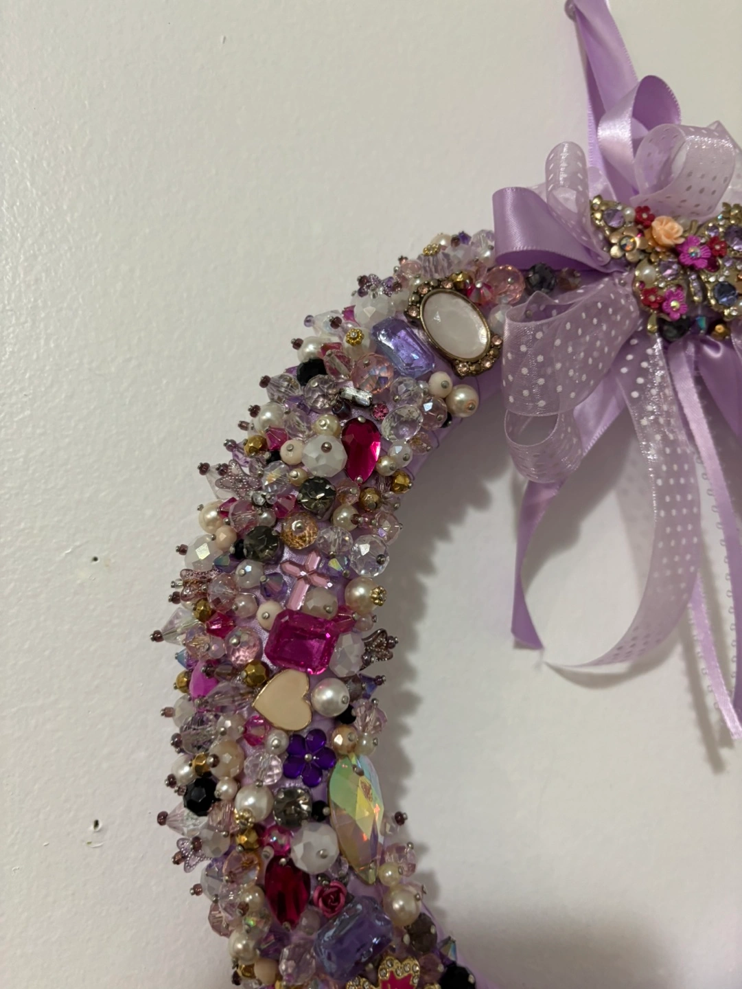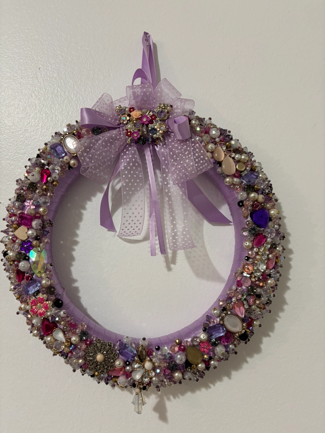 Purple wreath decorated with assorted beads and jewels. Features a bow with a butterfly brooch. Beautiful for home decor or Christmas decor or gift. Colours: purple, pink, pearl white, gold and black Price firm, cash only, payment at the time of pickup in Mississauga