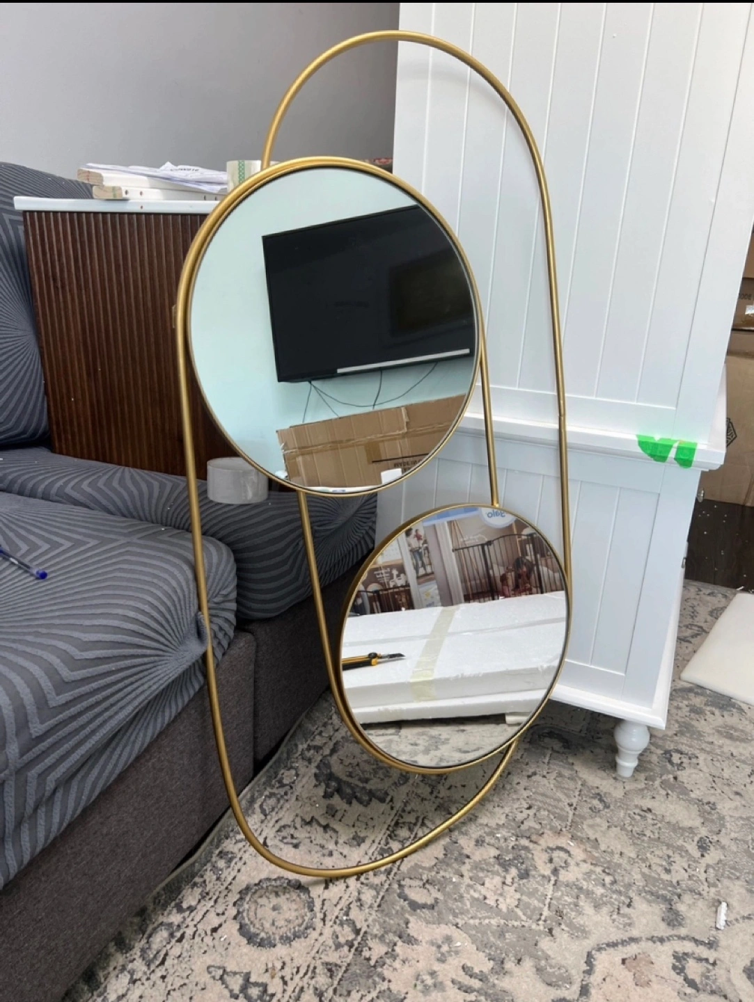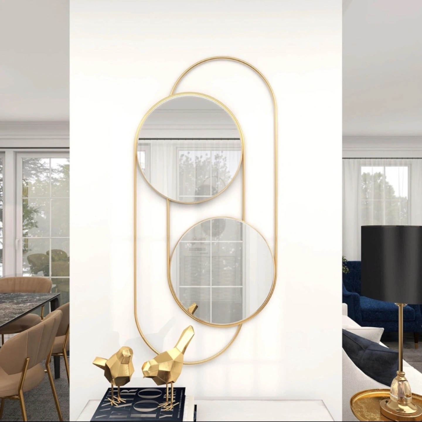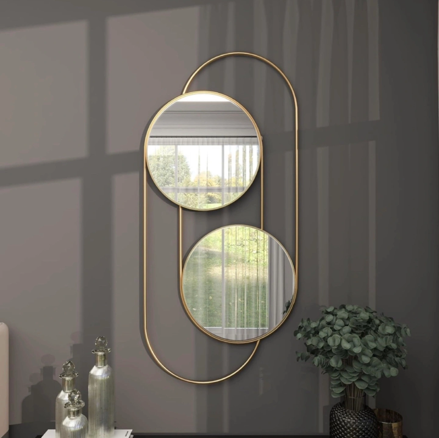 Gold coloured modern mirror with two round mirrors. Brand new OBO