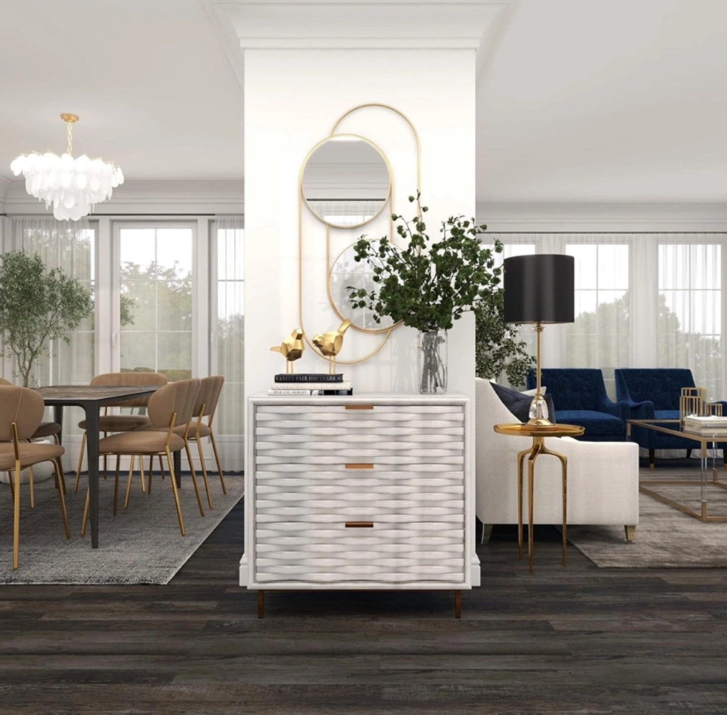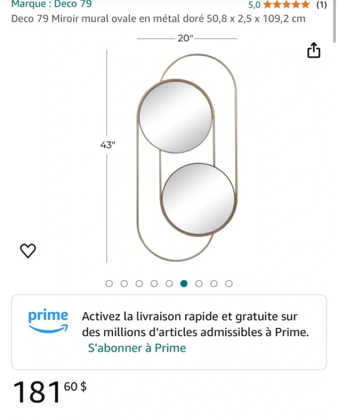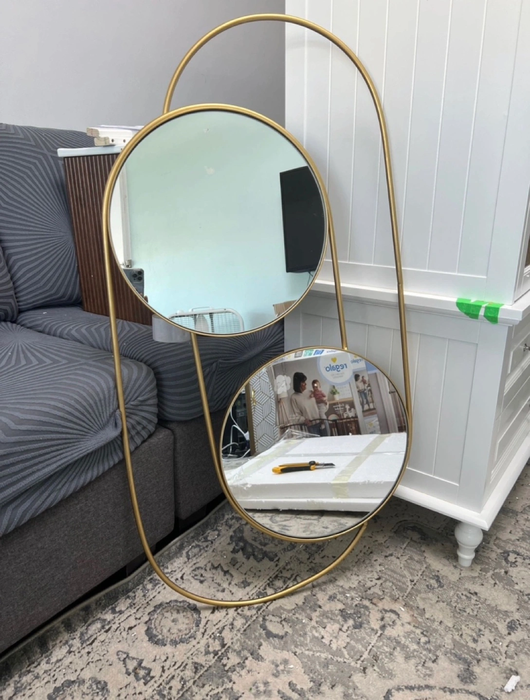 Gold coloured modern mirror with two round mirrors. Brand new OBO