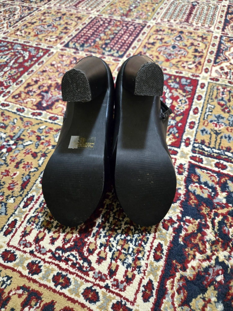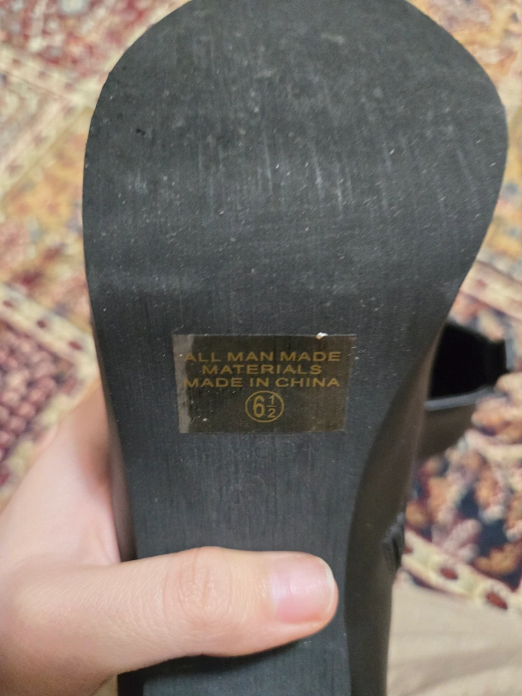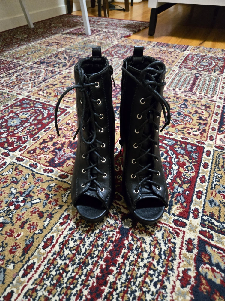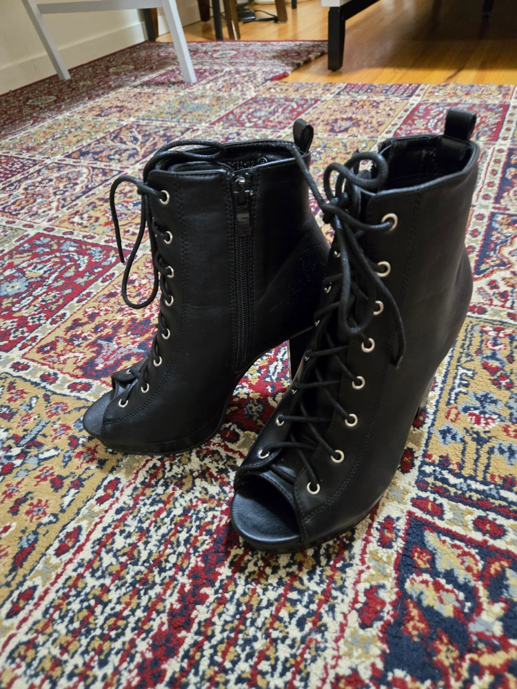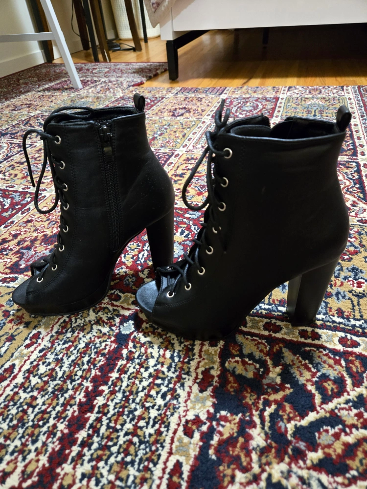 Black lace-up booties with a peep-toe and a chunky heel. Size 6.5
