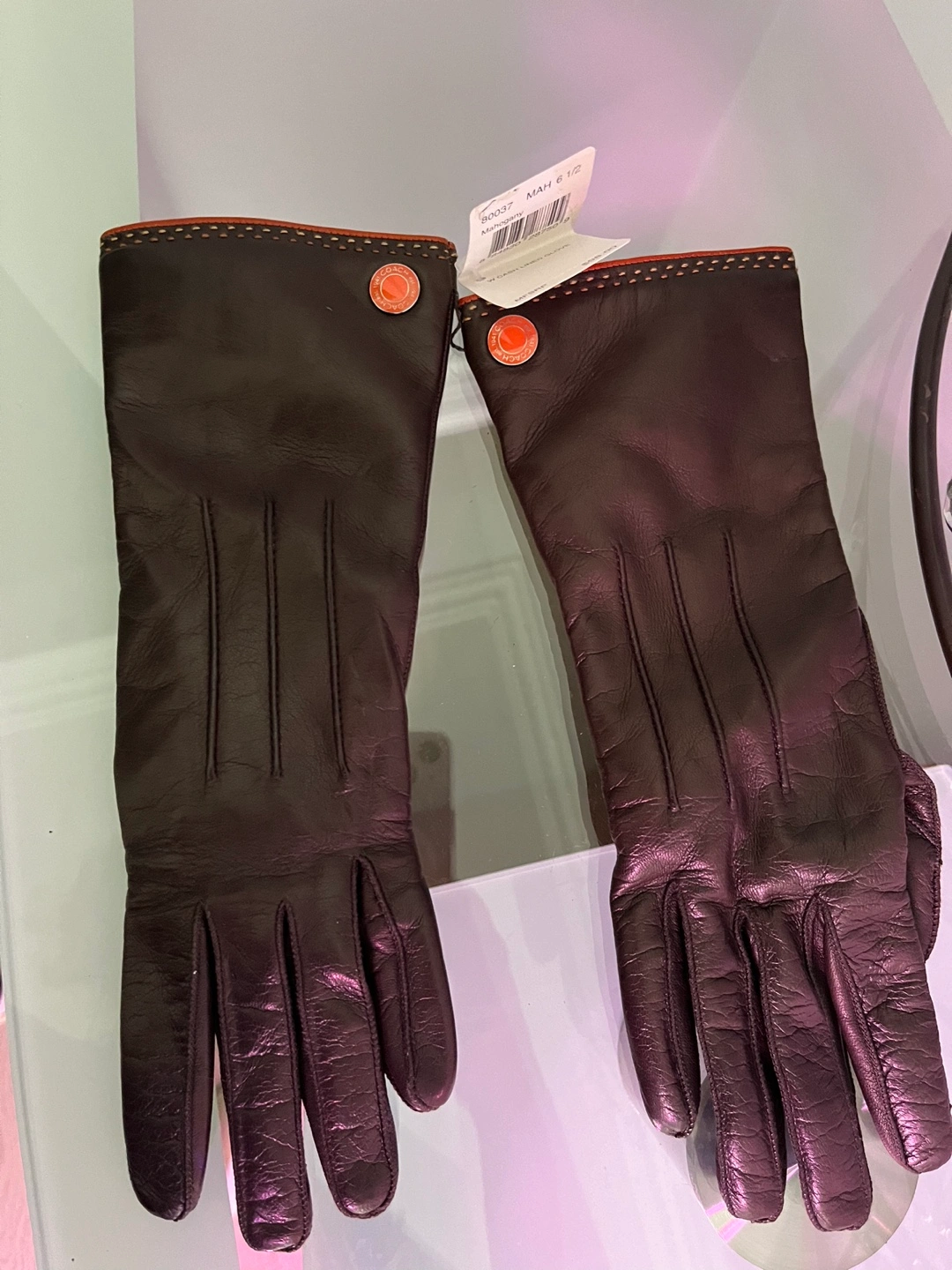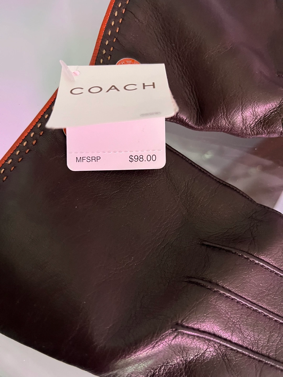 Brown leather gloves with orange trim. Lined with a soft material. On a narrow side