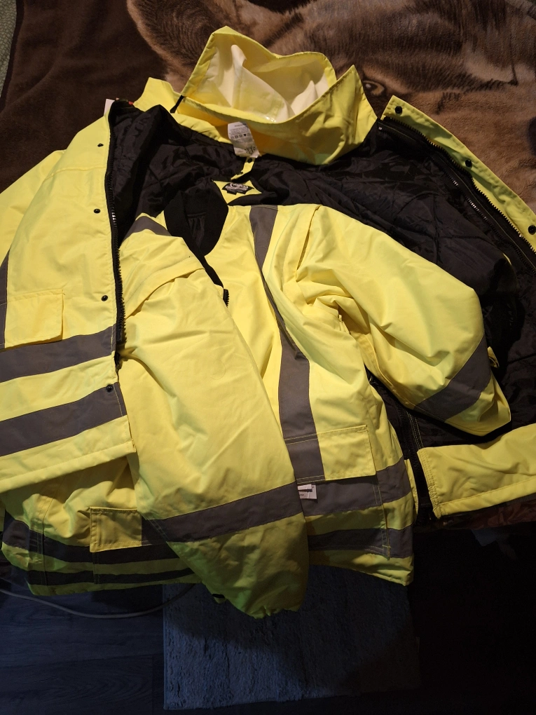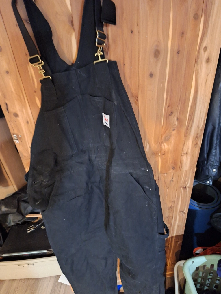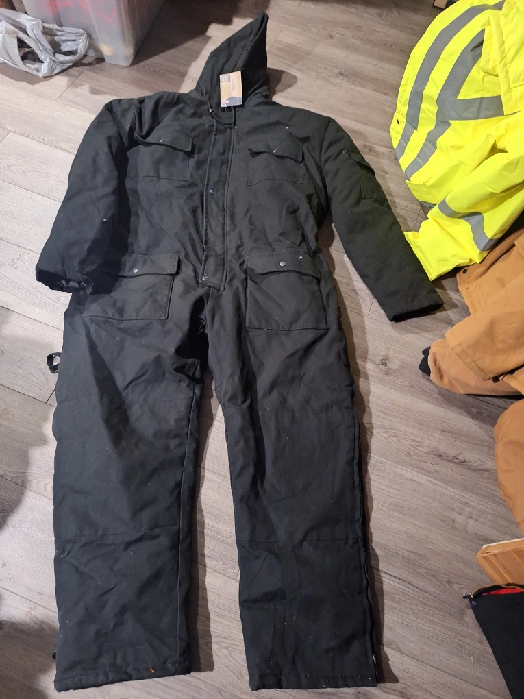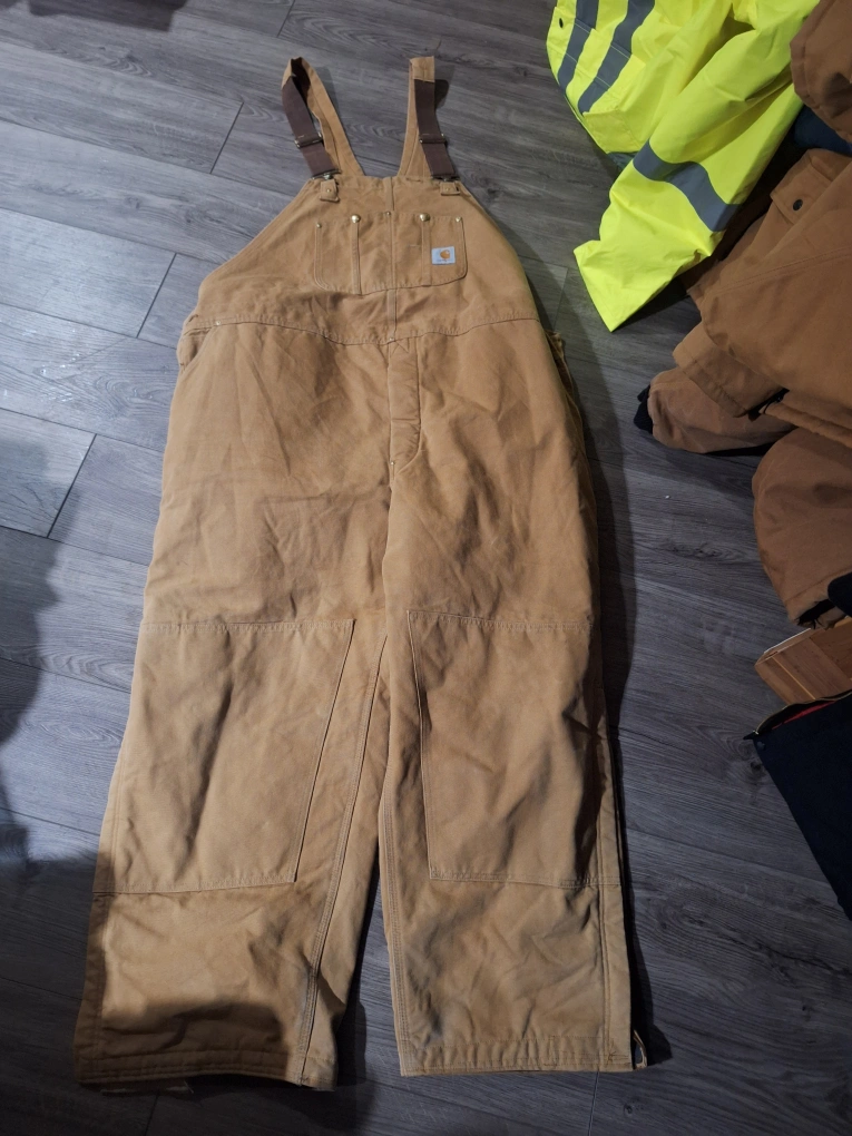 Bundle includes black overalls, black insulated coveralls, tan Carhartt overalls, and a yellow insulated jacket. All are in good condition. No rips or tears.