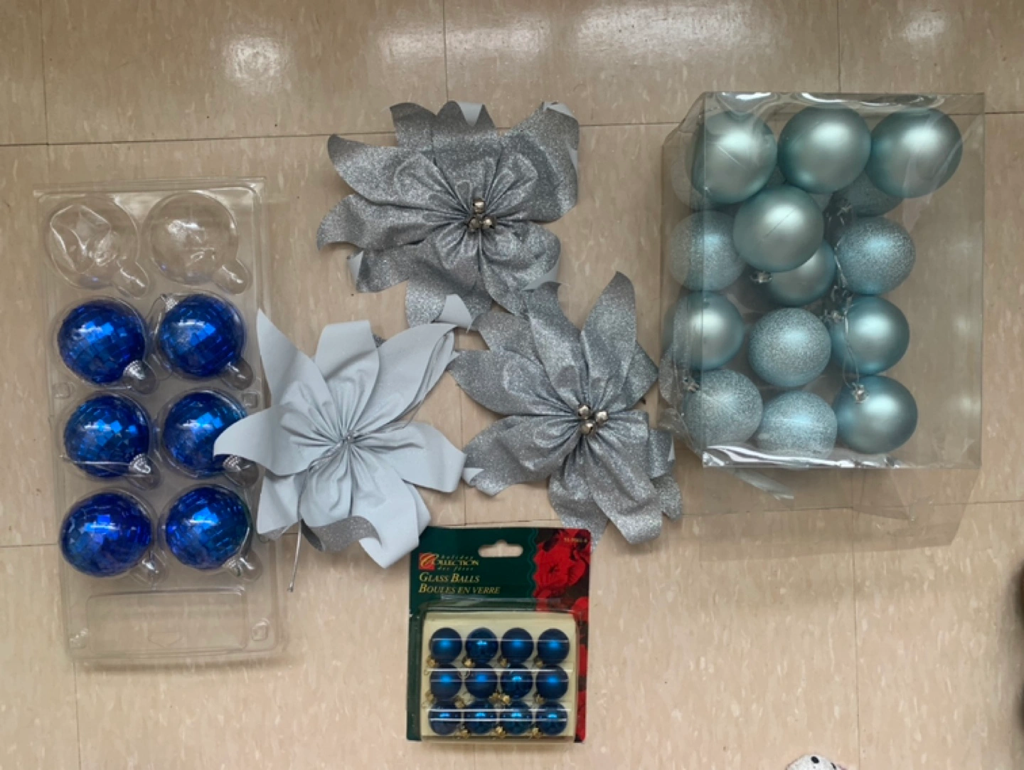 Blue and silver Christmas ornaments, and decorative silver flowers. One set of ornaments is in a clear plastic container with a label that says "Glass Balls/Balles en Verre". The other set is in a clear plastic package with a label on it.