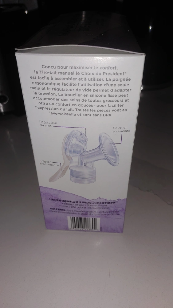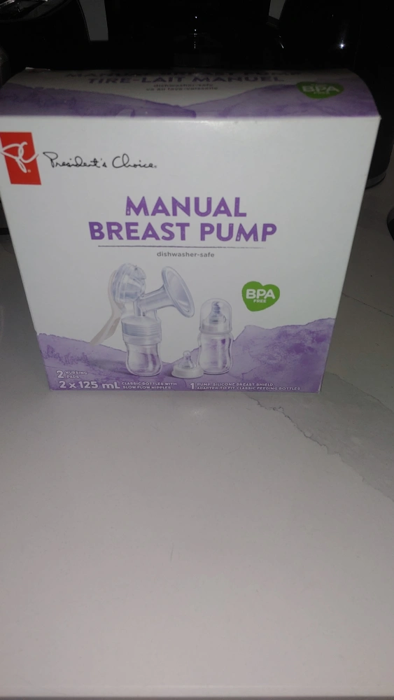 Manual breast pump. Includes two bottles, one breast pump, two nursing pads &:a silicone shield. Dishwasher safe.