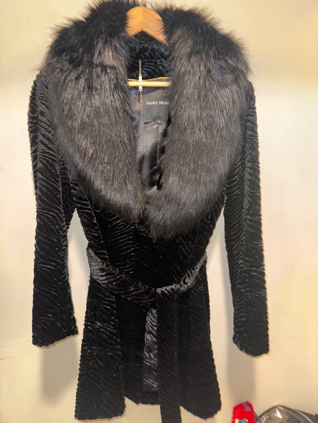 Black faux fur coat with a fur collar and a belt. Size small. New without tags. Hasn’t been worn.