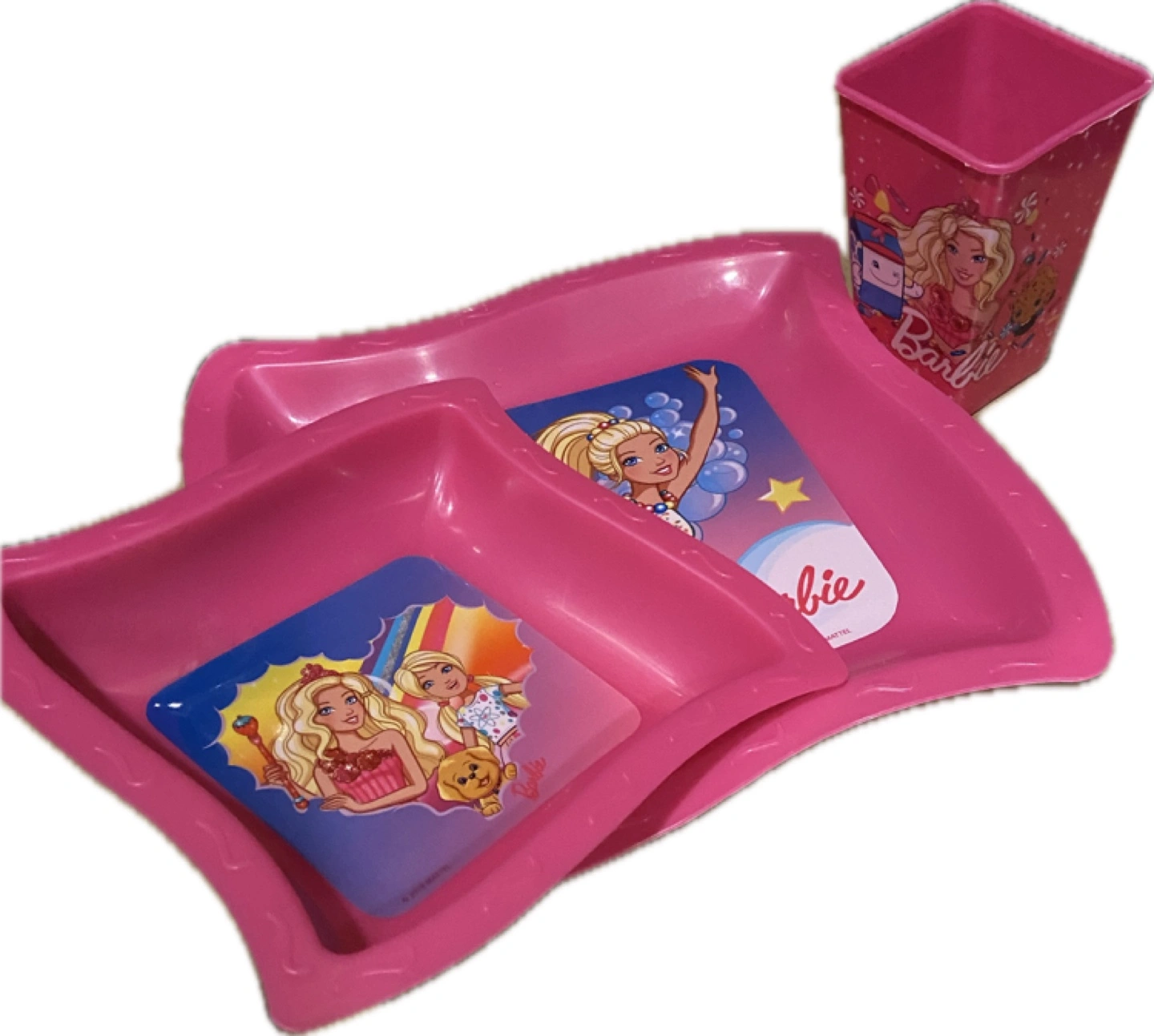 Pink plastic dinnerware set with a cup, two plates, and Barbie designs.