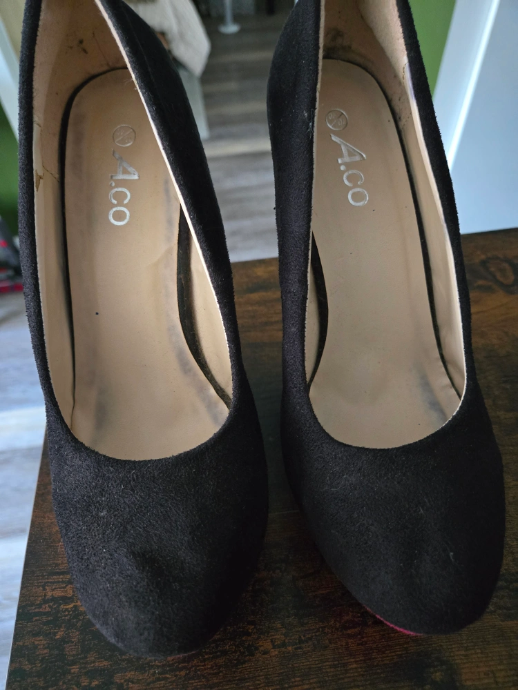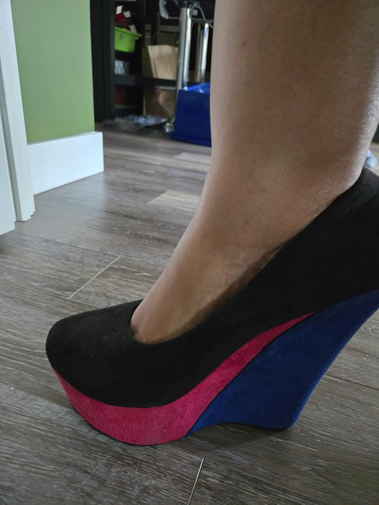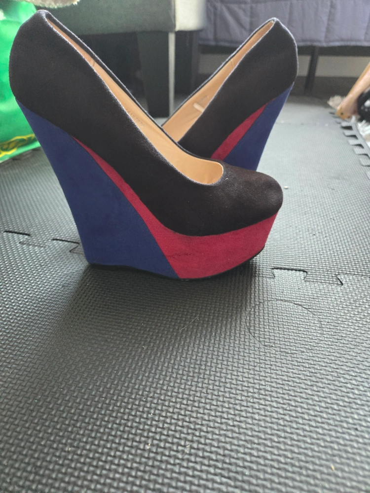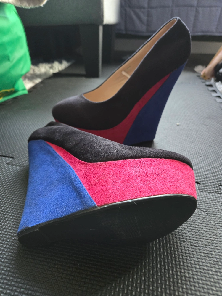 Black suede wedges with blue and pink accents. Size 9/10