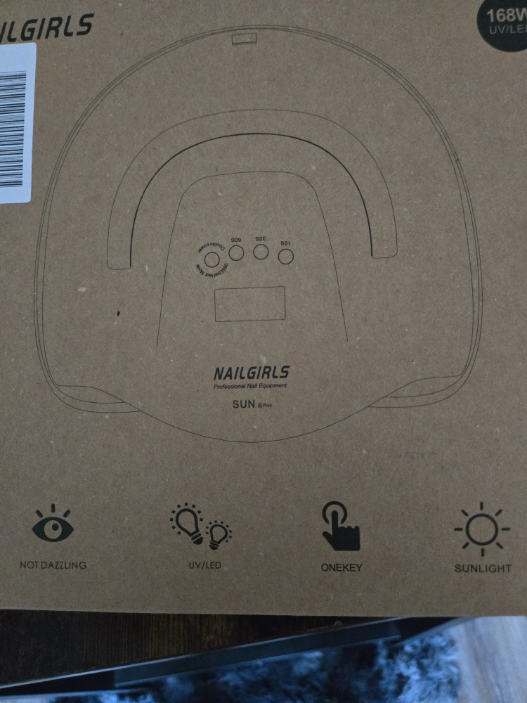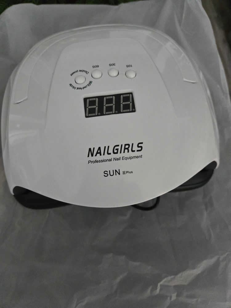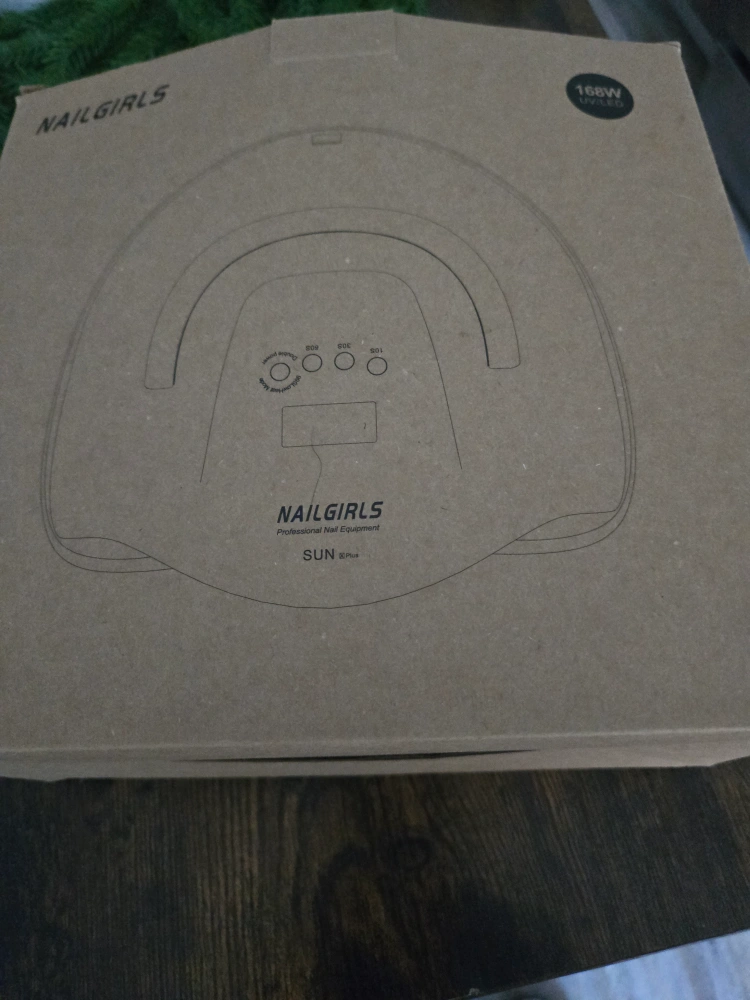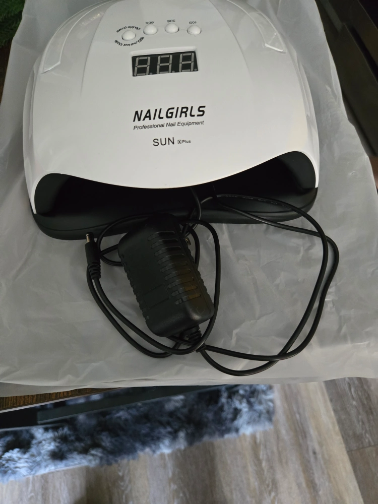 Nail lamp with a timer, includes power cord and adapter. Includes a box that says 168W UV/LED. UV nail polish thrown in for free