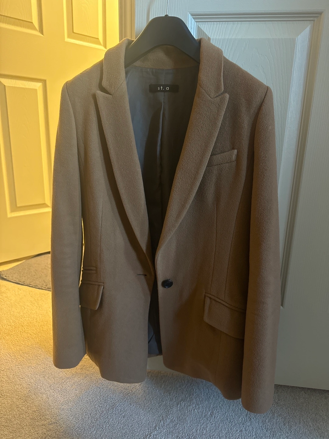 Camel blazer, single button closure, long sleeves, pockets on the front. 80 wool and 20 cashmere