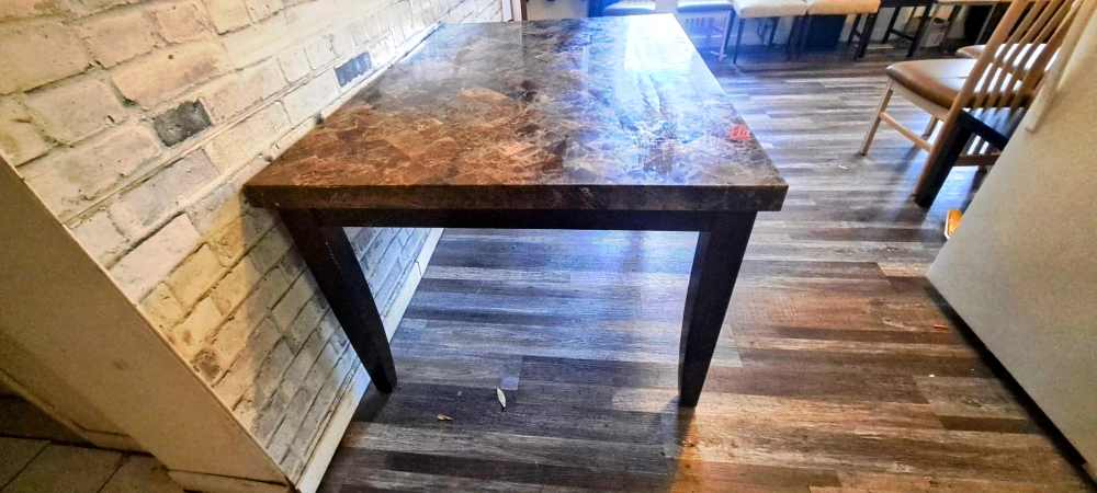 5ft (60Inches) long 42inches wide 31 inches tall Legs can come off with Allen key. Marble Table is in good condition. Solid and sturdy table with hardwood legs. If you're interested or have any questions, send me a message. It retails for $989+tax. I can help carry to your vehicle. I can also deliver in GTA for $100. -David Marble, natural stone, is extremely hardy and resilient, making it a great choice for dining room tables. Marble is a good option if you're looking for something more beautiful and more reasonably priced. Marble is a more traditional material for kitchen countertops and dining tables.The marble dining room table is robust and resistant to wear. Marble's high level of hardness results in great wear resistance. The second advantage is that maintenance is simple. Dining table with marble top and dark brown legs. Great for a small kitchen or dining room. In good condition. Elevate your dining experience with this stunning marble top dining table. Featuring a beautiful, polished marble surface with intricate patterns, this table is both stylish and functional. The sturdy wooden legs provide excellent support, making it perfect for family meals or entertaining guests. **Key Features:** - Elegant marble top with unique design - Durable wooden frame for stability - Ideal for dining rooms or kitchen spaces - Dimensions: Standard dining table size This table is in good condition, it retains its charm and functionality. Perfect for anyone looking to add a touch of sophistication to their home.