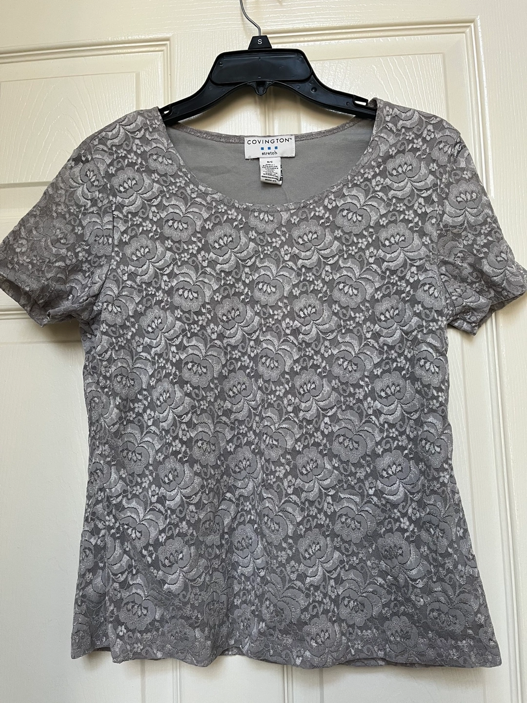 Grey lace top with short sleeves and a round neckline. Made with stretch fabric.
