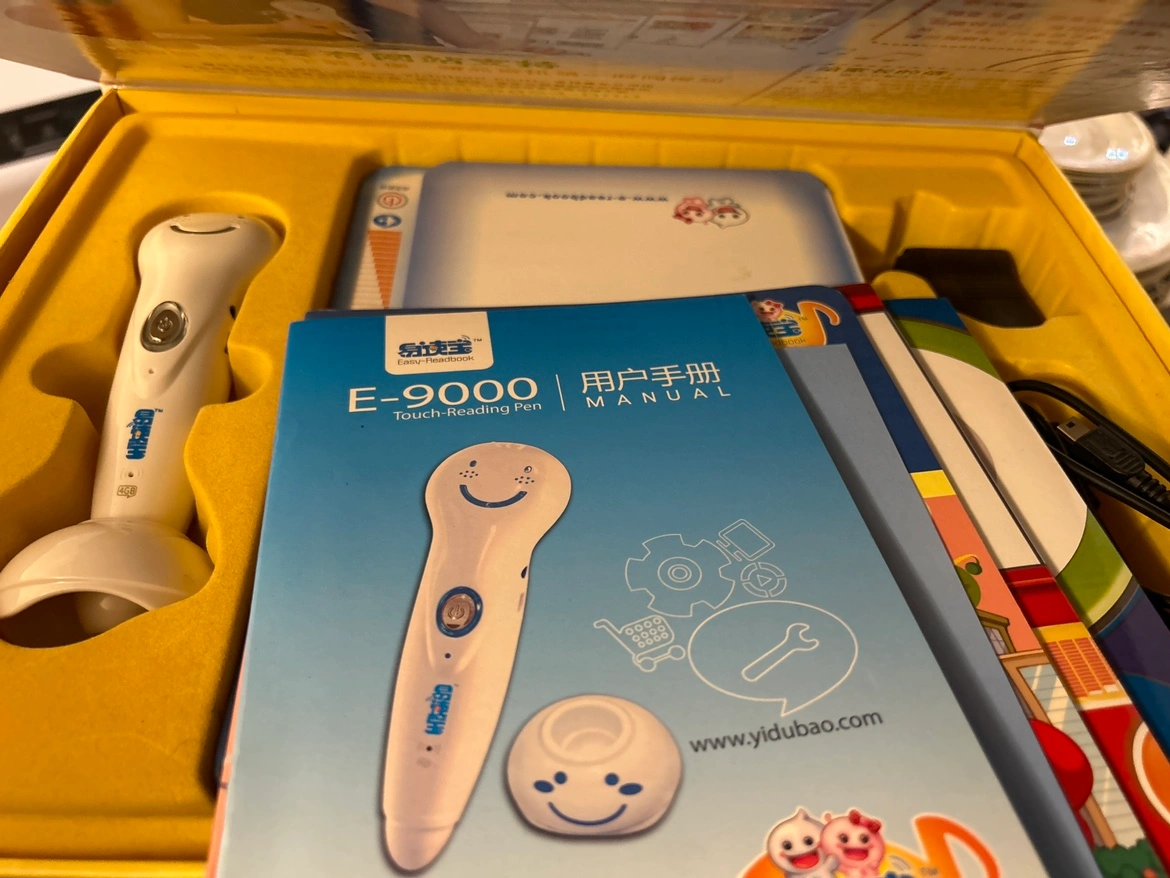 Touch-reading pen with USB cable and manual. Includes a charging station.