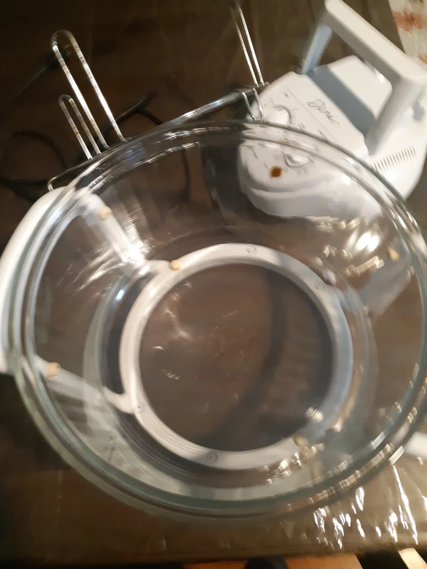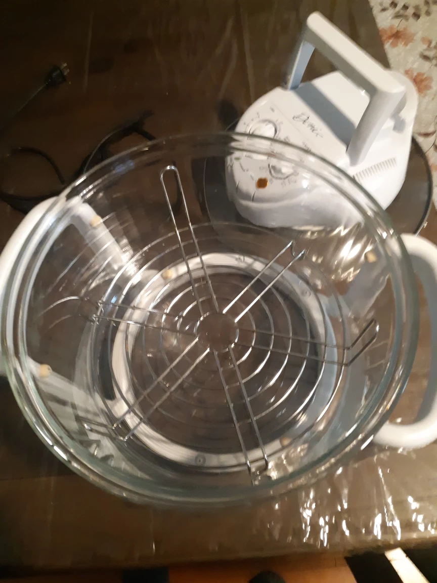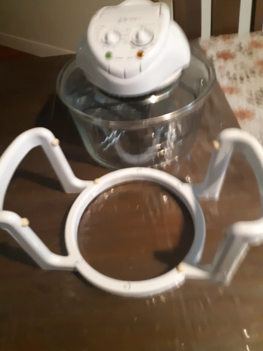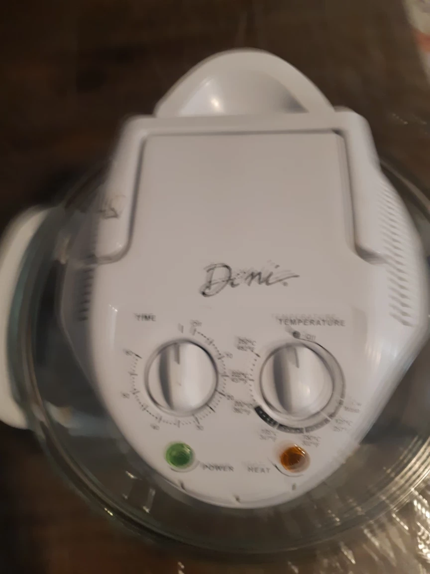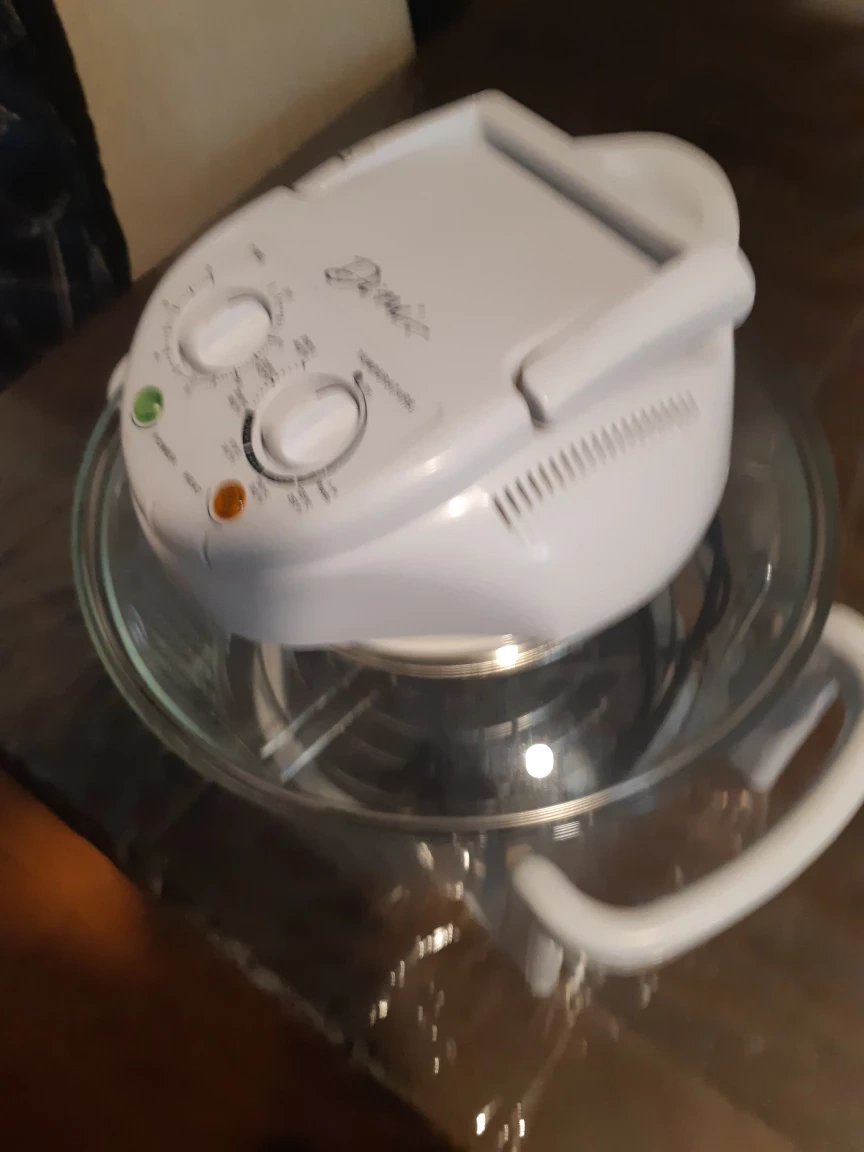 White rotisserie oven with glass bowl, rack, and base. Has temperature and timer controls Deni Air Fryer, Halogen Infrared Convection Oven - Large 13 Quart Glass Air Fryer, Oil-Free Quick Healthy Meals Multicooker with Time & Temperature Controls, Roast, Fry, Toast or Crisp.