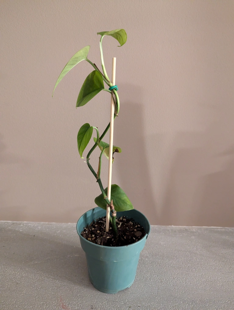 Small potted plant in a teal pot. Plant is a vine with a wooden stake for support. cash only main pick up: 399 the west mall alternative pick up: Sephora @ Union Station