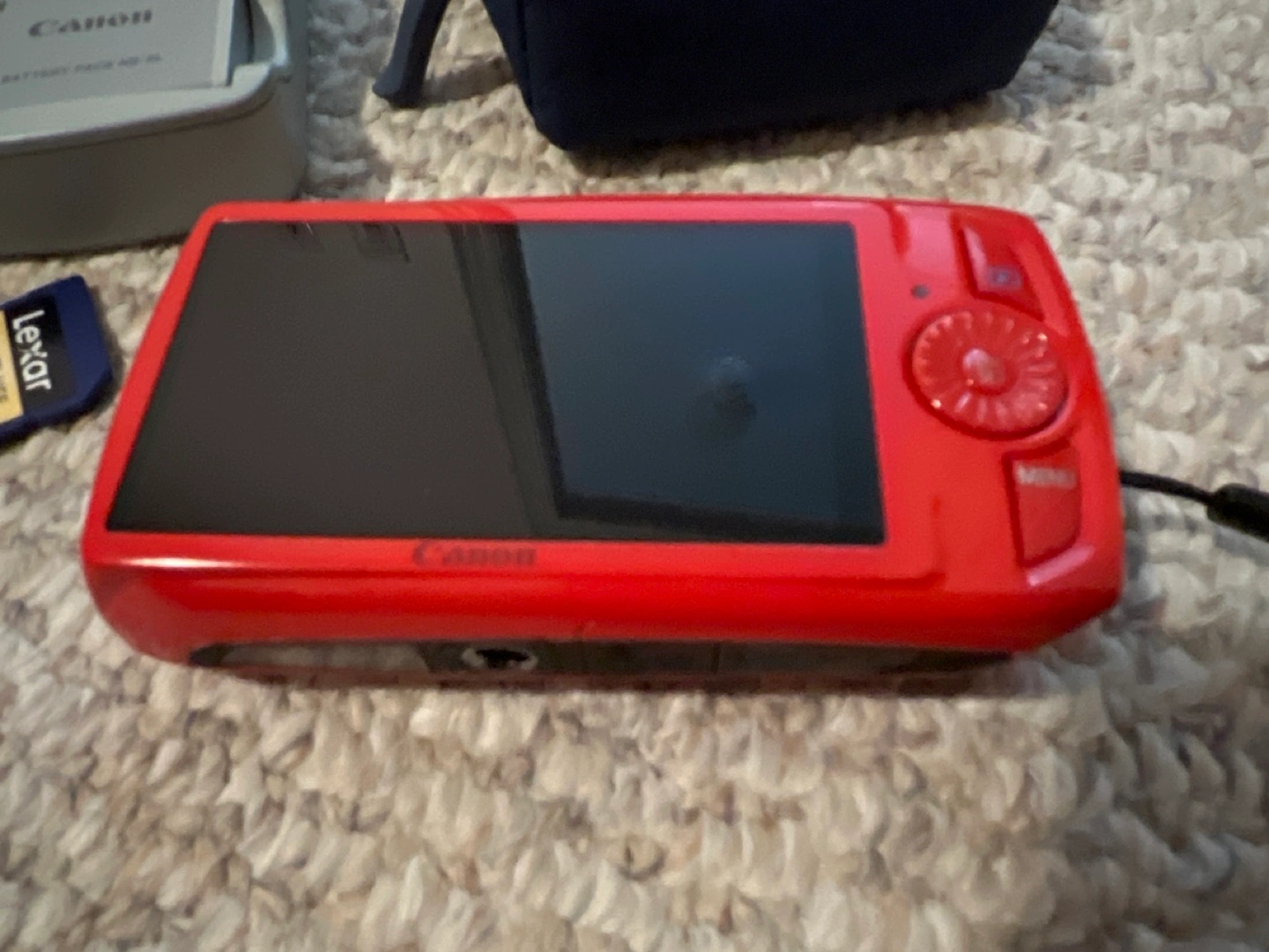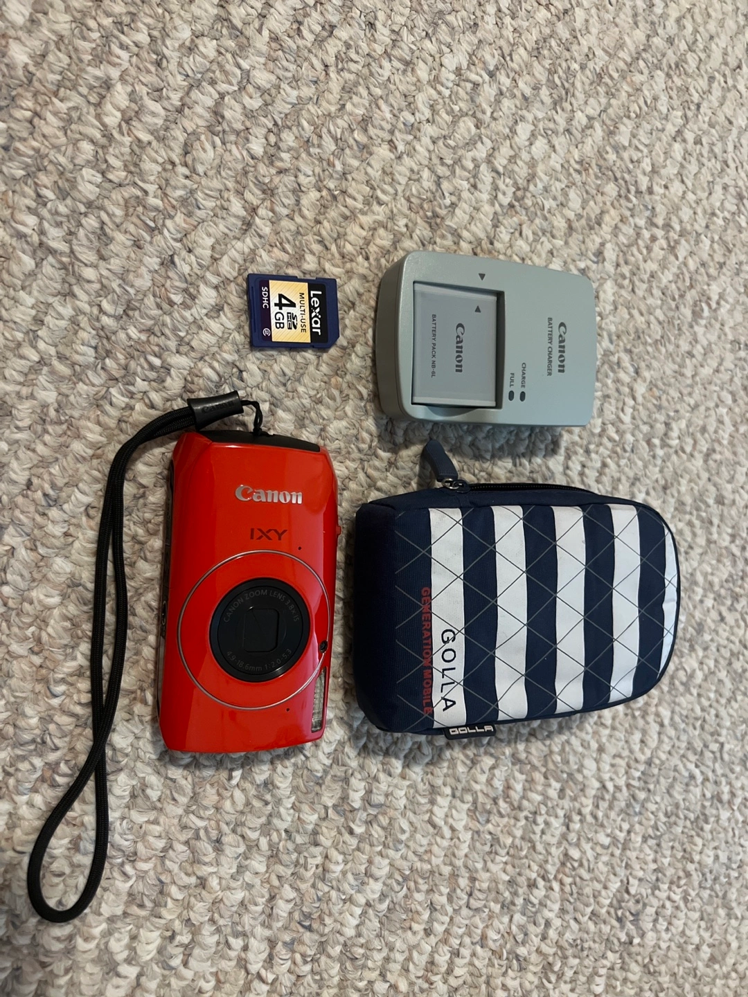 Red Canon IXY digital camera with a battery charger, carrying case, and 4 GB Lexar memory card. Perfect condition Cash & pickup only