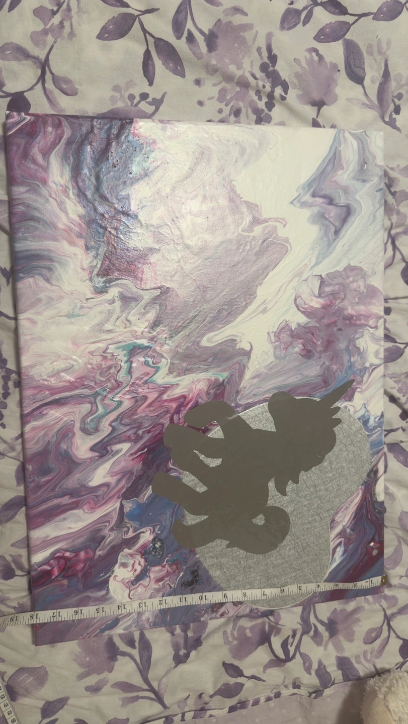 Original acrylic painting on canvas. Purple and pink abstract background with a chrome unicorn silhouette. Measures approximately 24 x 18 inches.