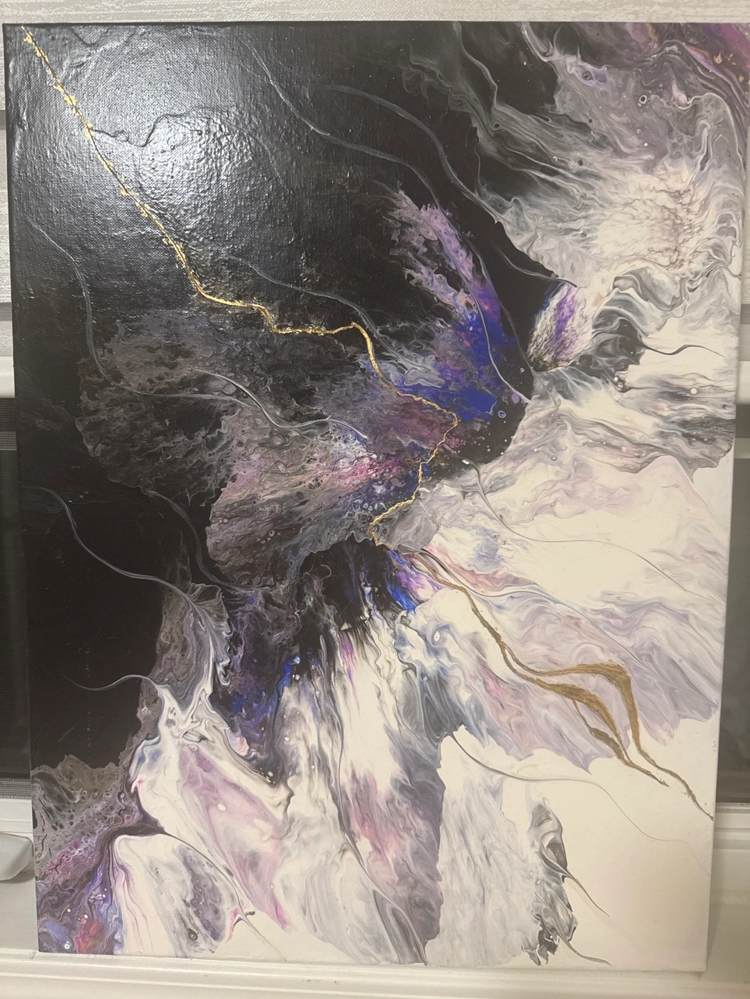 Original acrylic painting on canvas. White, black, blue, purple, gold, and silver colours are used.