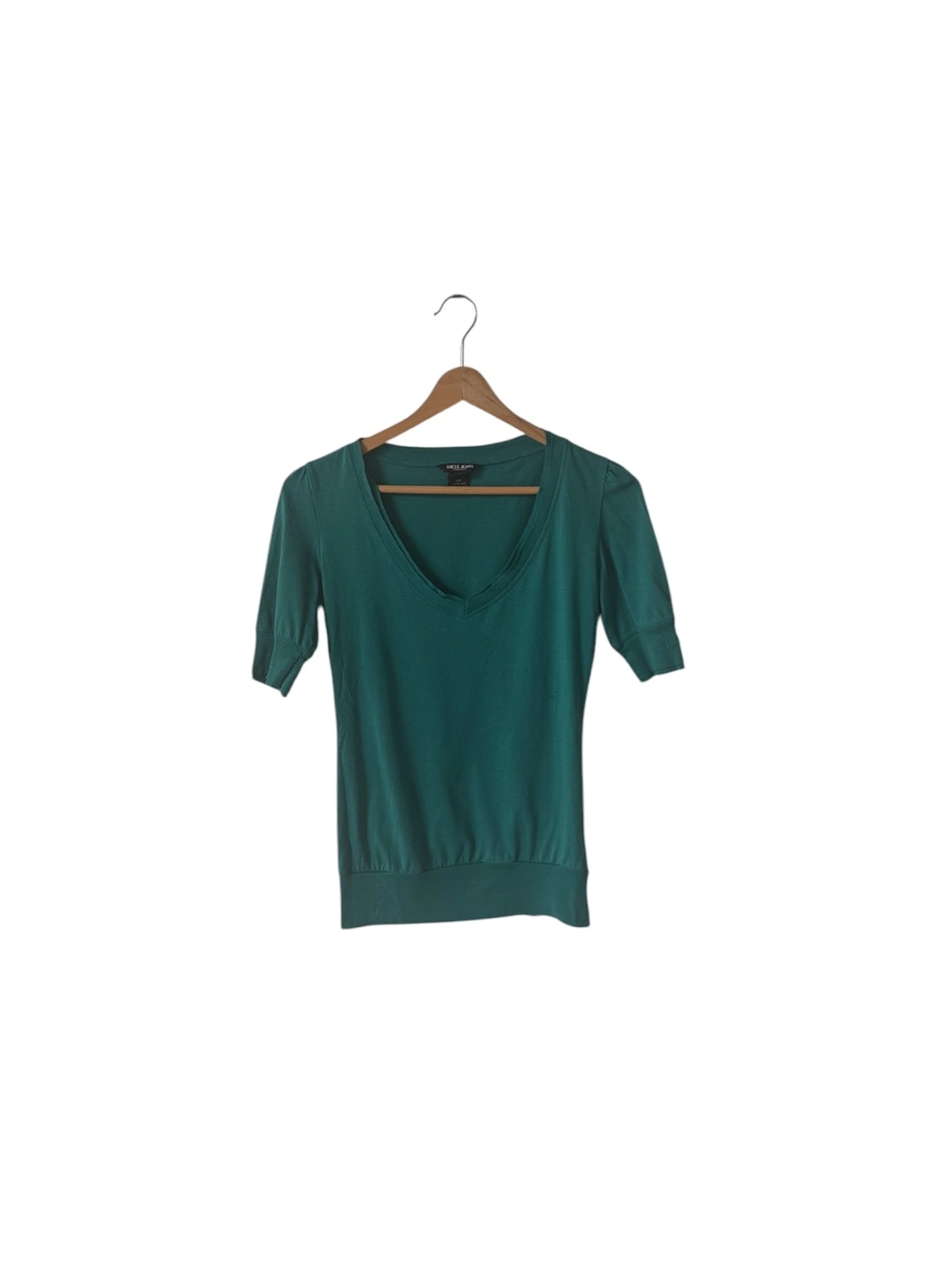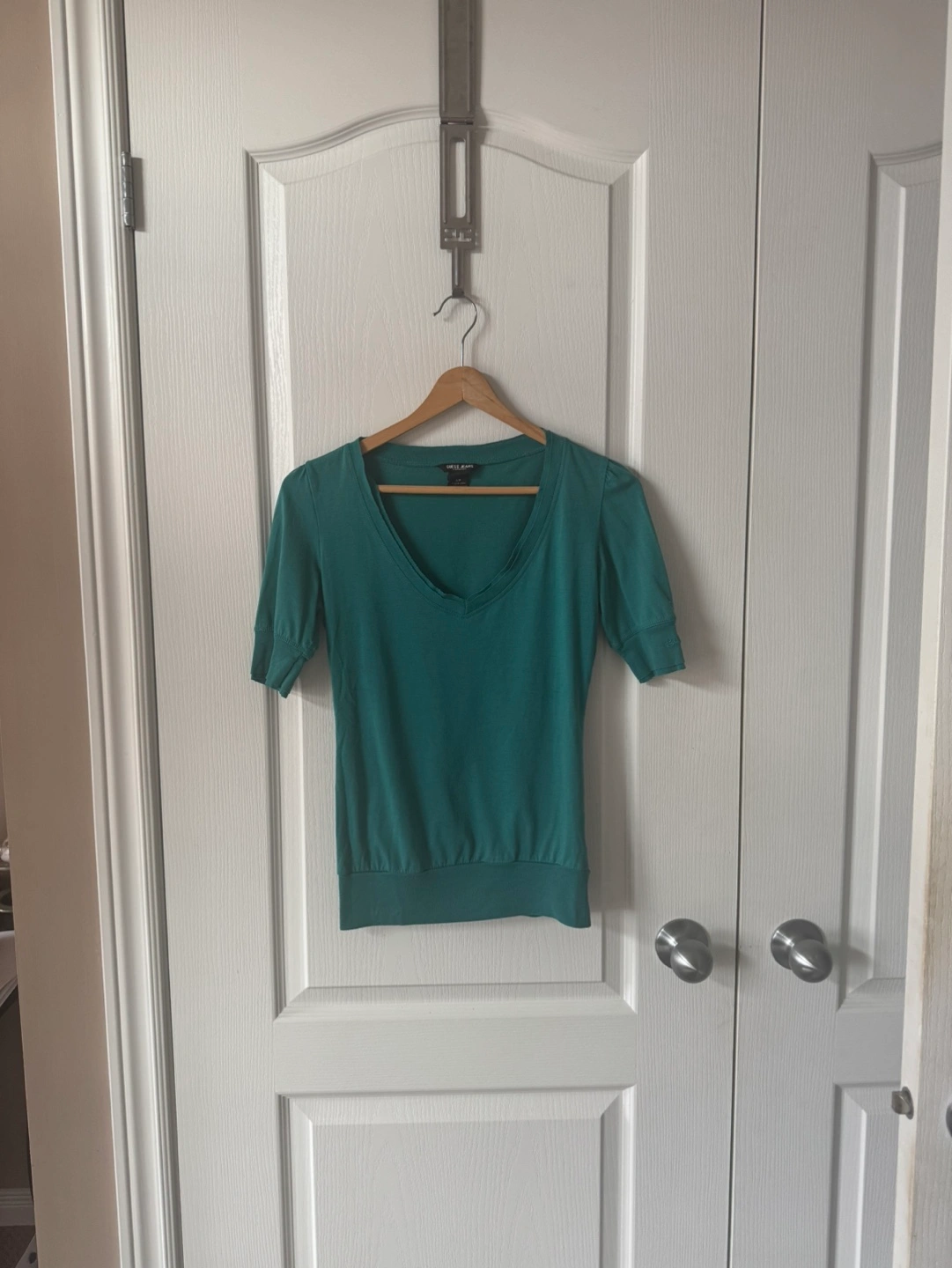 Teal V-neck t-shirt with short sleeves. Size S/P.