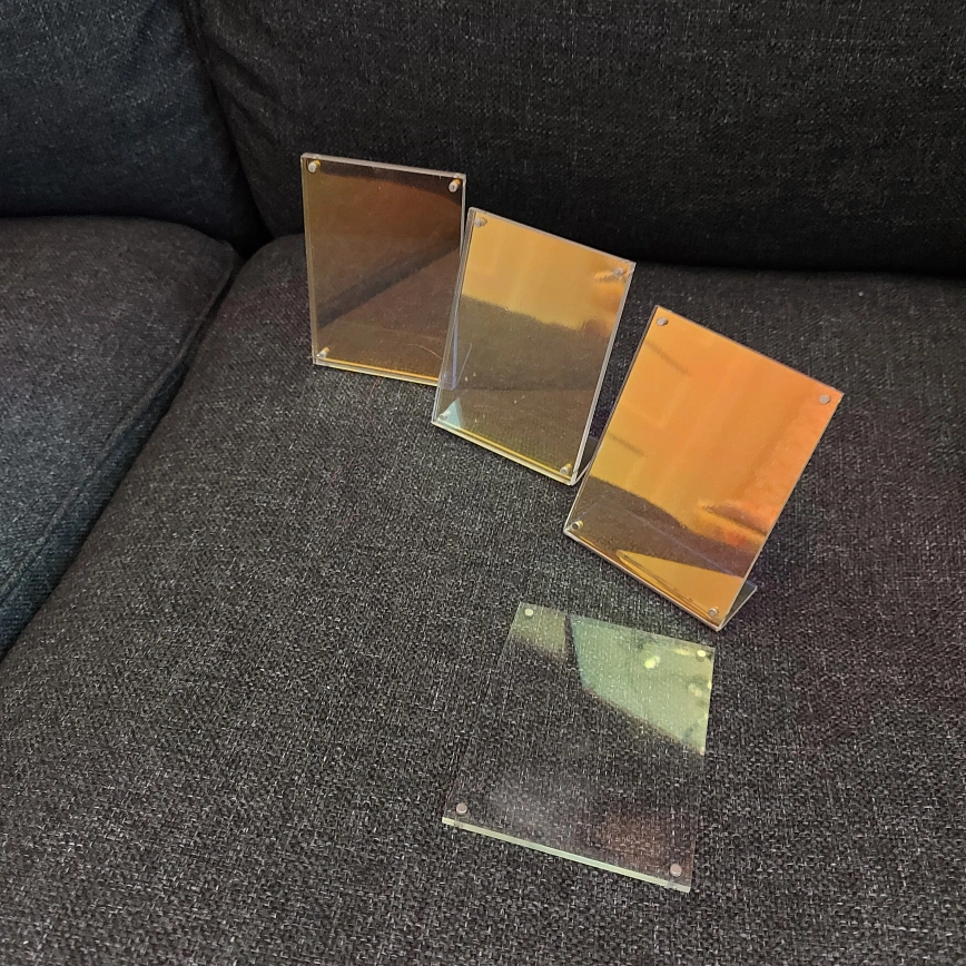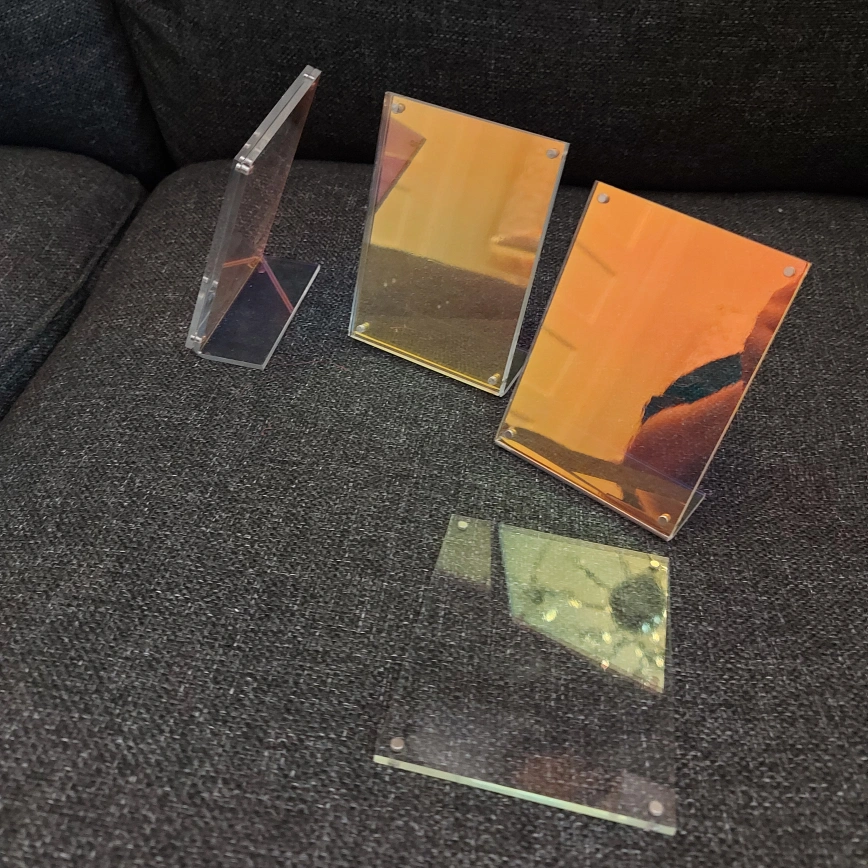 Set of 3 shiny picture frames. Front cover is held on by magnets at the four corners. Fits instax mini film prints. Used and has some scratches and wear to them.