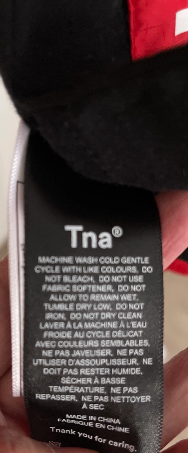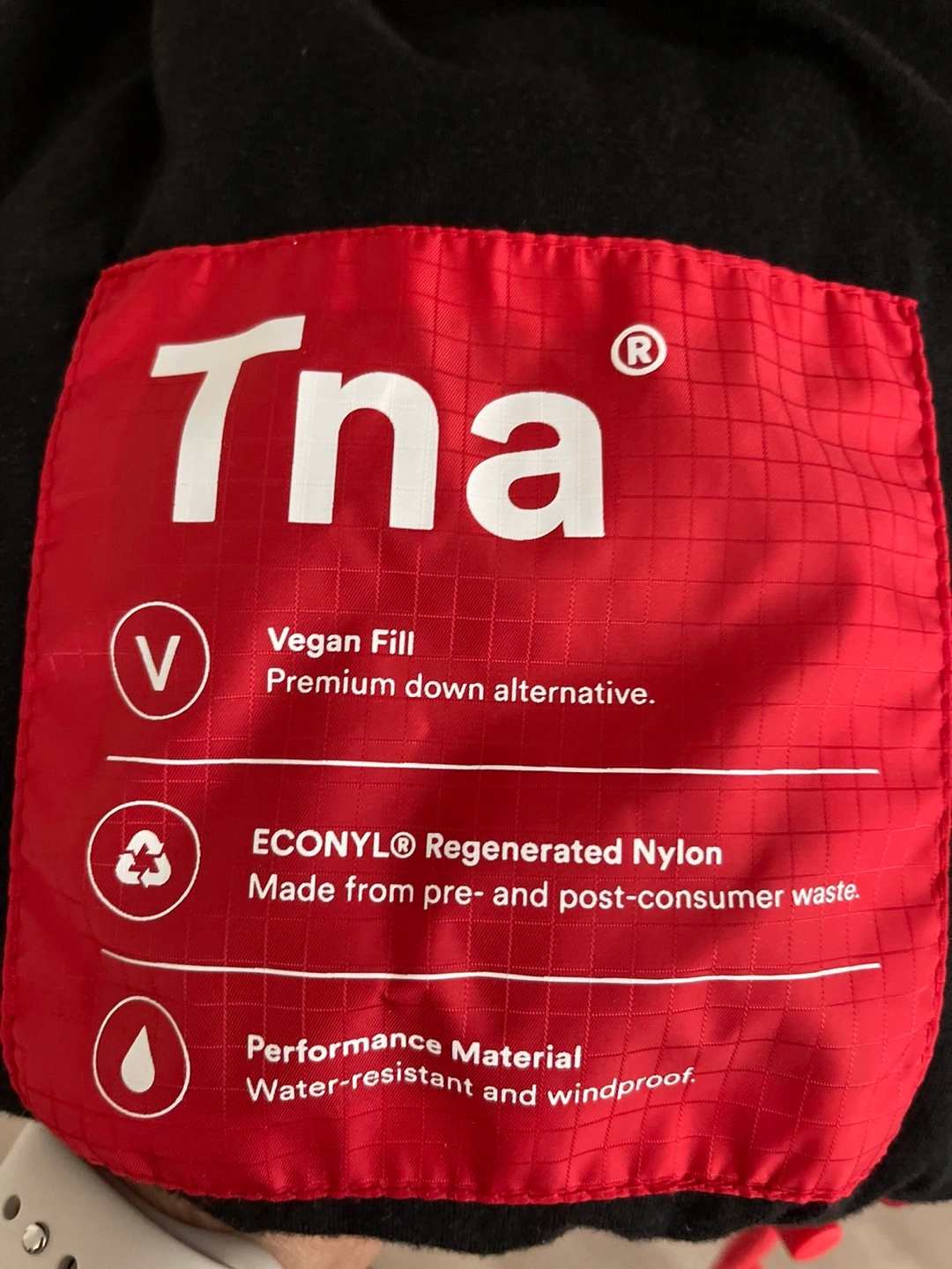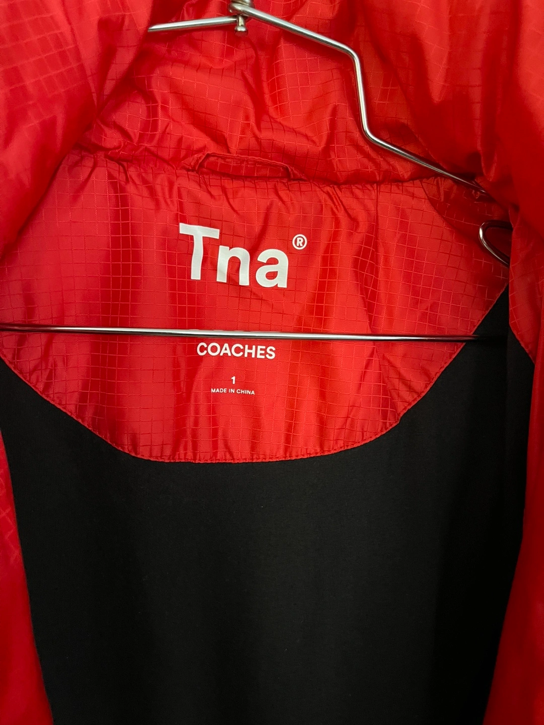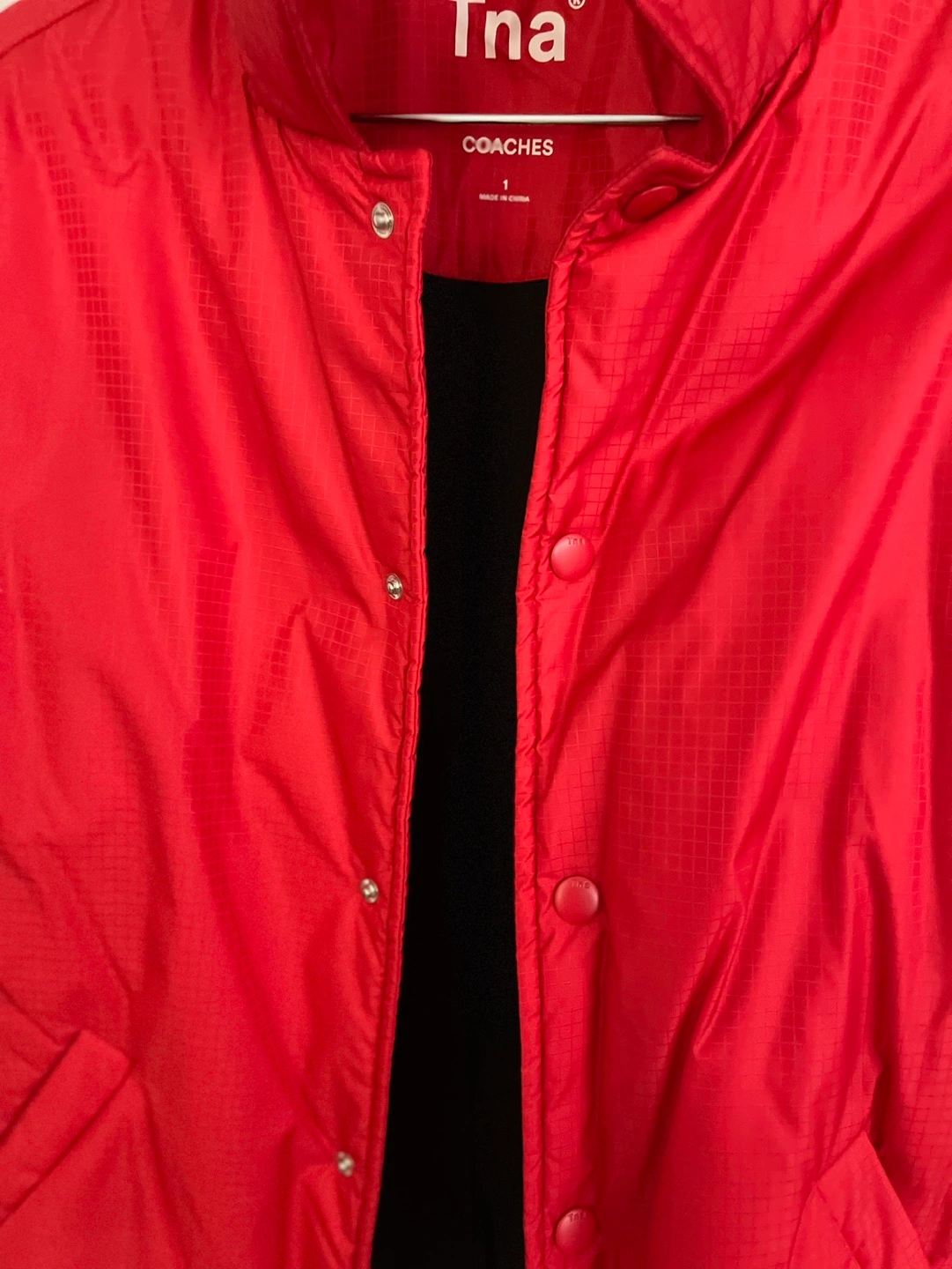 Red puffer jacket with a high collar and snap buttons. The jacket has a drawstring hem and two pockets. Excellent condition, only wore it once.