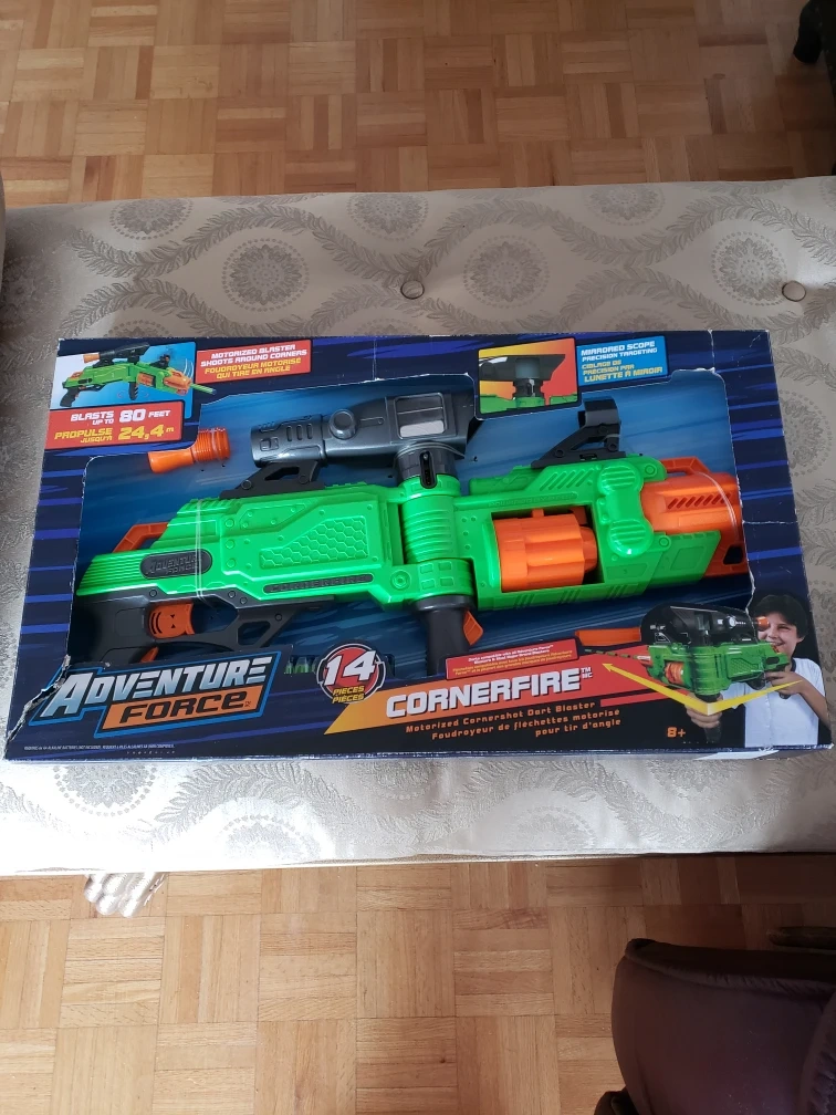 Green Dart blaster with scope, shoots up to 80 feet, holds 14 darts. New in box. makes a nice Christmas gift.