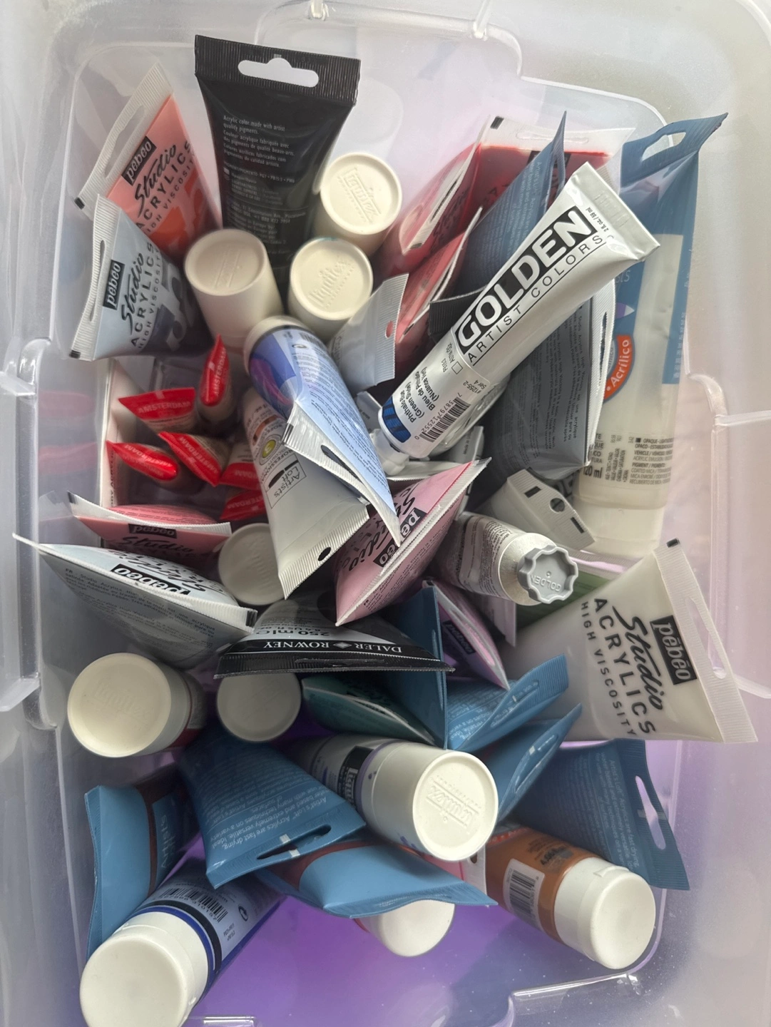 Bulk lot of acrylic paint tubes in various colours and brands. Includes Golden, Pebeo, liquitex basics and professional and Artist’s Loft Level 1-3 brands. Most tubes unopened and some were used once or twice. Assortment of colours. I also have mediums. Just ask if you want a specific colour I will check if I have it. Depending on the paint and whether it’s unopened they are selling for around 5$. New tubes are 50% off retail. I have way too many to list .. you would have to come take a look Mediums, paints … pigments dyes resin canvas’
